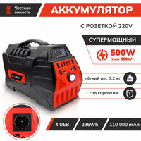 Имеет встроенную европейскую розетку 220v мощностью 500w (пик 650w) и эффективную ёмкость 110 000 mAh 296Wh, 4 выхода usb и выход на 12v мощность 136w (тип штекера прикуривателя авто).