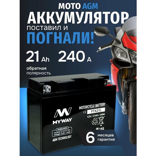 Мото аккумулятор 12 вольт 21 ампер MYWAY YTX21L-BS AGM обеспечивает длительный срок службы и превосходную производительность даже в самых экстремальных условиях. Правильно подобранный акб мотоцикла 12в 21ач – гарантия длительной поездки и нормального запуска ДВС.