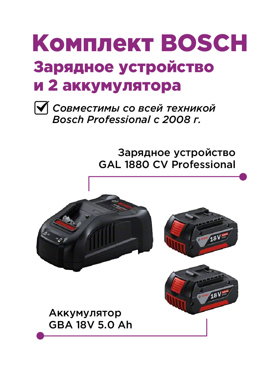 Купить Aккумулятор GBA 18V 5.0 Ah 2 шт. + зарядное устройство GAL 1880 CV Professional Bosch, 1600A00B8J с доставкой по всей России.