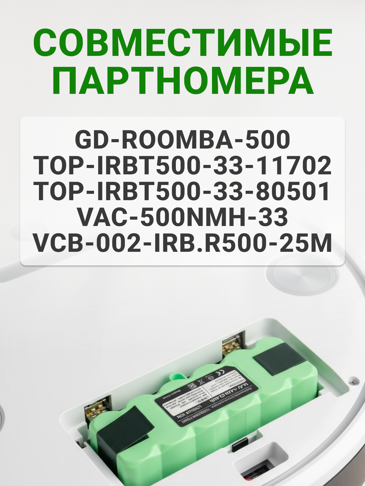 Совместимые партномера: GD-ROOMBA-500, VCB-002-IRB. R500-25M, TOP-IRBT500-33-80501, TOP-IRBT500-33-11702, VAC-500NMH-33.