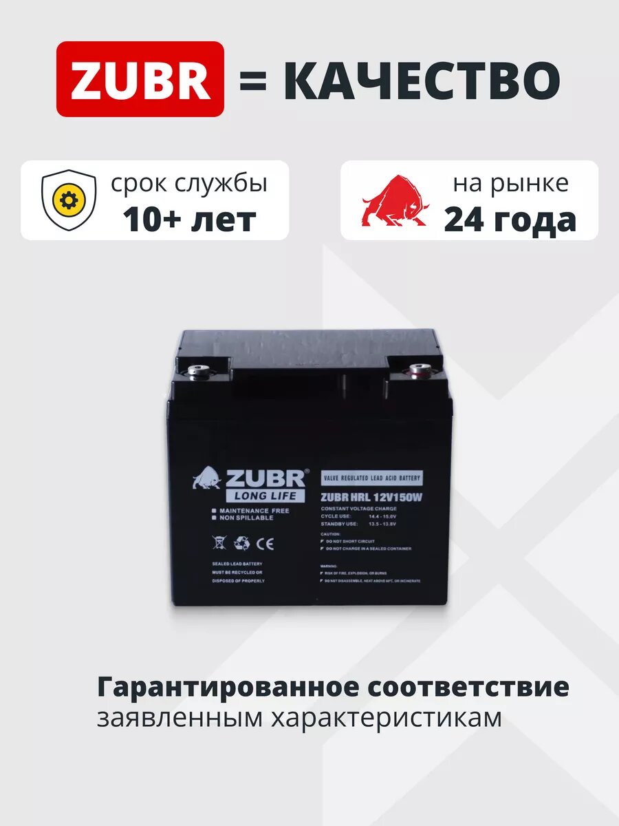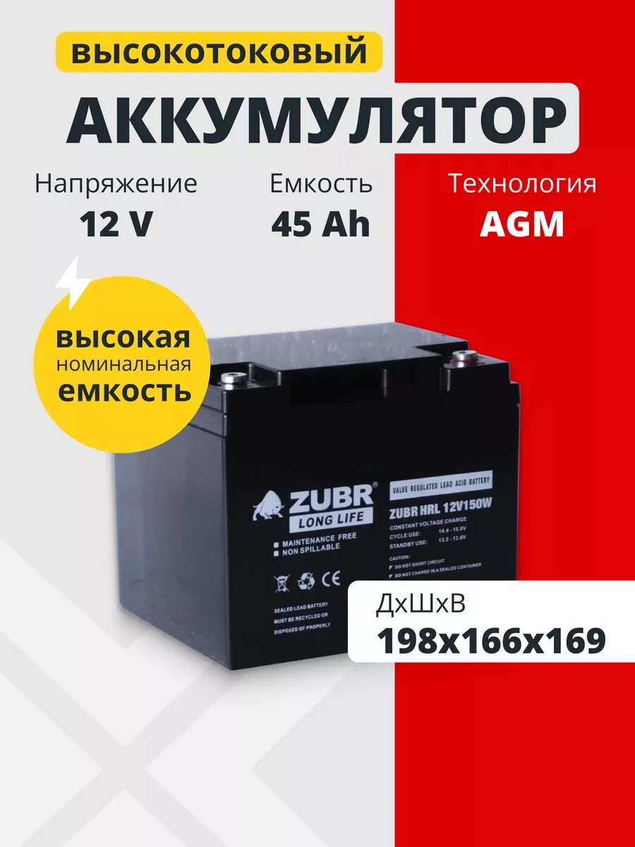 Аккумулятор для ибп ZUBR HRL AGM 12v 45ah – устройство, предназначенное для обеспечения стабильного электропитания при отключении основного источника энергии. Бесперебойник для дома, компьютера играет важную роль в защите оборудования от потерь данных и повреждений, вызванных внезапными сбоями электроснабжения. Одним из лидеров на рынке стационарных аккумуляторов 12 вольт является серия ZUBR, гарантирующая надежность и эффективность в работе источников бесперебойного питания. В аккумуляторе AGM 12В электролит абсорбирован в стекловолоконном сепараторе, что обеспечивает герметичность, устойчивость к вибрациям и низкое электрическое сопротивление. Они отличаются высокой стойкостью к глубокому разряду, большим количеством циклов перезаряда, прочным корпусом. Аккумуляторы для детской машины, мотоцикла, электромобиля являются безопасными для человека и окружающей среды, поскольку не выделяют вредных паров и не подвержены вытеканию электролита. Еще одно преимущество аккумуляторов для машинки на радиоуправлении – их можно монтировать в произвольном положении под наклоном, даже в перевернутом состоянии. Аккумуляторы для бесперебойника не требуют обслуживания, рекомендованы для использования как в буферном, так и циклическом режимах. Акб для источников резервного питания являются универсальными: медицинское, торговое оборудование, пк, компьютеры, газовые и электро котлы отопления, аварийное освещение, системы видеонаблюдения, охранная пожарная сигнализация, извещатель, телекоммуникации, связь, промышленные установки, электропастухи, насосы, детские машинки, скутеры, квадроциклы, электромашины, игрушки для ребенка, инвалидные коляски, опрыскиватели садовые умница, осветительные и переносные приборы, солнечные панели и батареи. Регулярно проверяйте состояние и уровень заряда акб для ибп. В нашем магазине можно приобрести подходящее зарядное устройство. Перед покупкой уточните рабочие параметры ранее установленной свинцово-кислотной батареи.