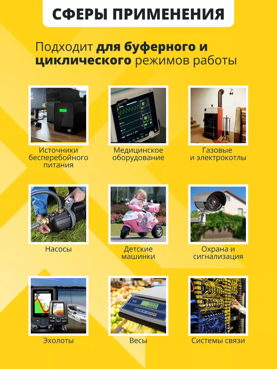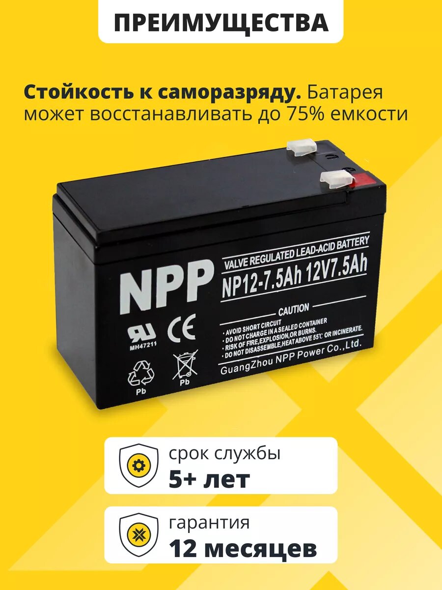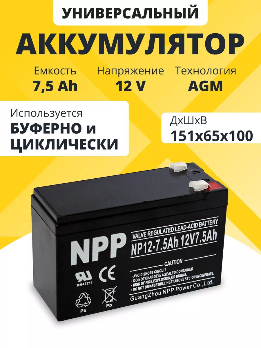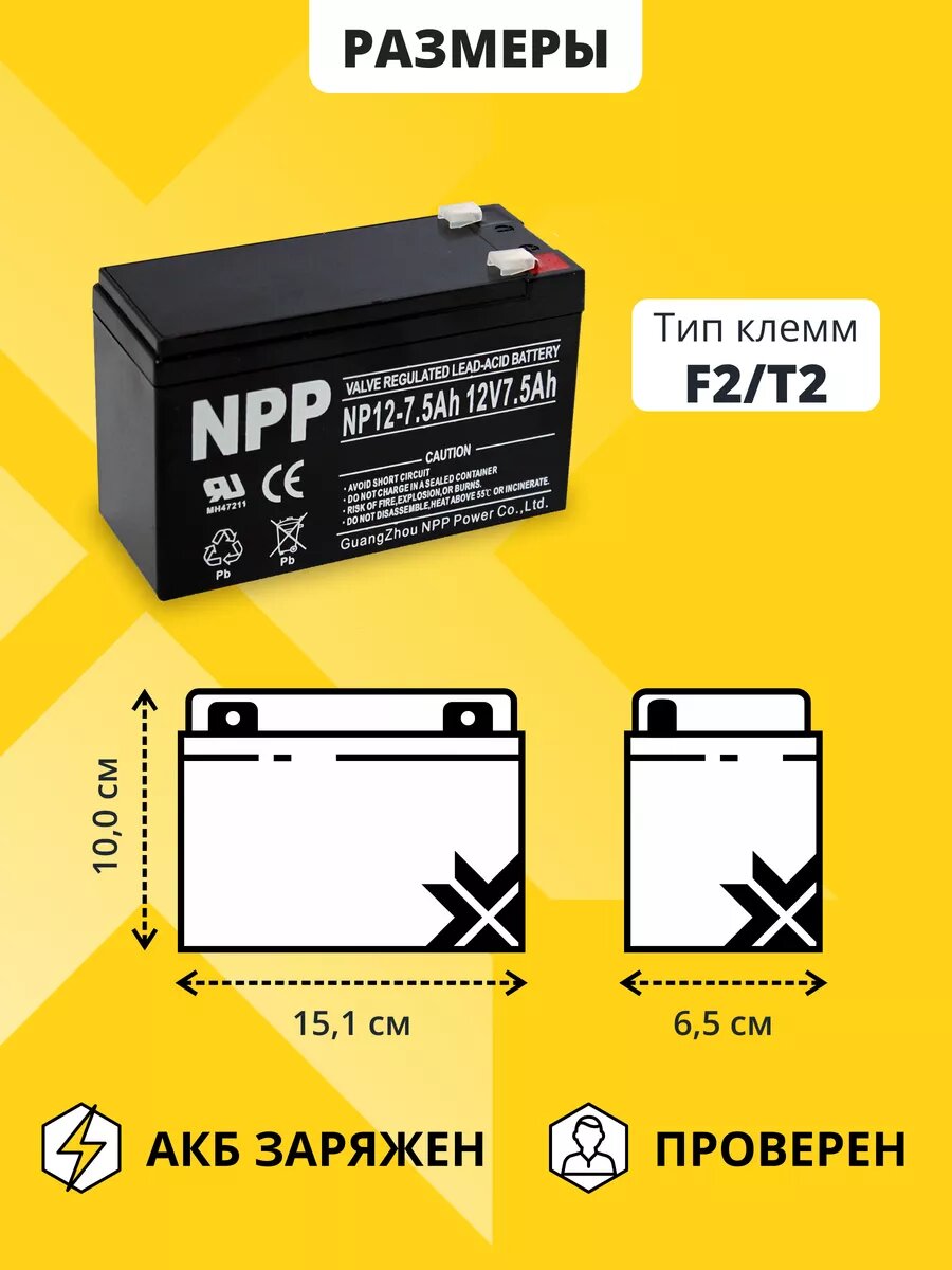 Аккумулятор для ибп NPP AGM 12v 7,5ah – устройство, предназначенное для обеспечения стабильного электропитания при отключении основного источника энергии. Бесперебойник для дома, компьютера играет важную роль в защите оборудования от потерь данных и повреждений, вызванных внезапными сбоями электроснабжения. Одним из лидеров на рынке стационарных аккумуляторов 12 вольт является серия NPP, гарантирующая надежность и эффективность в работе источников бесперебойного питания. В аккумуляторе AGM 12В электролит абсорбирован в стекловолоконном сепараторе, что обеспечивает герметичность, устойчивость к вибрациям и низкое электрическое сопротивление. Они отличаются высокой стойкостью к глубокому разряду, большим количеством циклов перезаряда, прочным корпусом. Аккумуляторы для детской машины, мотоцикла, электромобиля являются безопасными для человека и окружающей среды, поскольку не выделяют вредных паров и не подвержены вытеканию электролита. Еще одно преимущество аккумуляторов для машинки на радиоуправлении – их можно монтировать в произвольном положении под наклоном, даже в перевернутом состоянии. Аккумуляторы для бесперебойника не требуют обслуживания, рекомендованы для использования как в буферном, так и циклическом режимах. Акб для источников резервного питания являются универсальными: кассовые аппараты, кассы, медицинское, торговое оборудование, пк, компьютеры, газовые и электро котлы отопления, аварийное освещение, системы видеонаблюдения, охранная пожарная сигнализация, извещатель, телекоммуникации, связь, промышленные установки, электропастухи, эхолоты 12v, насосы, детские машинки, скутеры, квадроциклы, электромашины, игрушки для ребенка, инвалидные коляски, фонари, фонарики, весы, опрыскиватели садовые умница, осветительные и переносные приборы, солнечные панели и батареи, инкубаторы. Регулярно проверяйте состояние и уровень заряда акб для ибп. Перед покупкой уточните рабочие параметры ранее установленной свинцово-кислотной батареи.