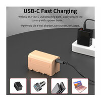 Литий-ионный аккумулятор Kingma T-NPF750 – аналог оригинальной батареи Sony NP-F750. Аккумулятор обладает высокой емкостью: 5200 мАч, а встроенный USB-C порт и контроллер заряда позволяют заряжать эту батарею без специального устройства: просто подключите ее к универсальному сетевому адаптеру, USB-аккумулятору или другому источнику питания. Благодаря этому вы с легкостью сможете зарядить батарею не только дома, но и в дороге. На корпусе расположен двухцветный светодиодный индикатор: во время зарядки он горит красным, при достижении 100% – зеленым. Предусмотрена защита от глубокого разряда, избыточного заряда, короткого замыкания, повышенного напряжения, повышенной силы тока.