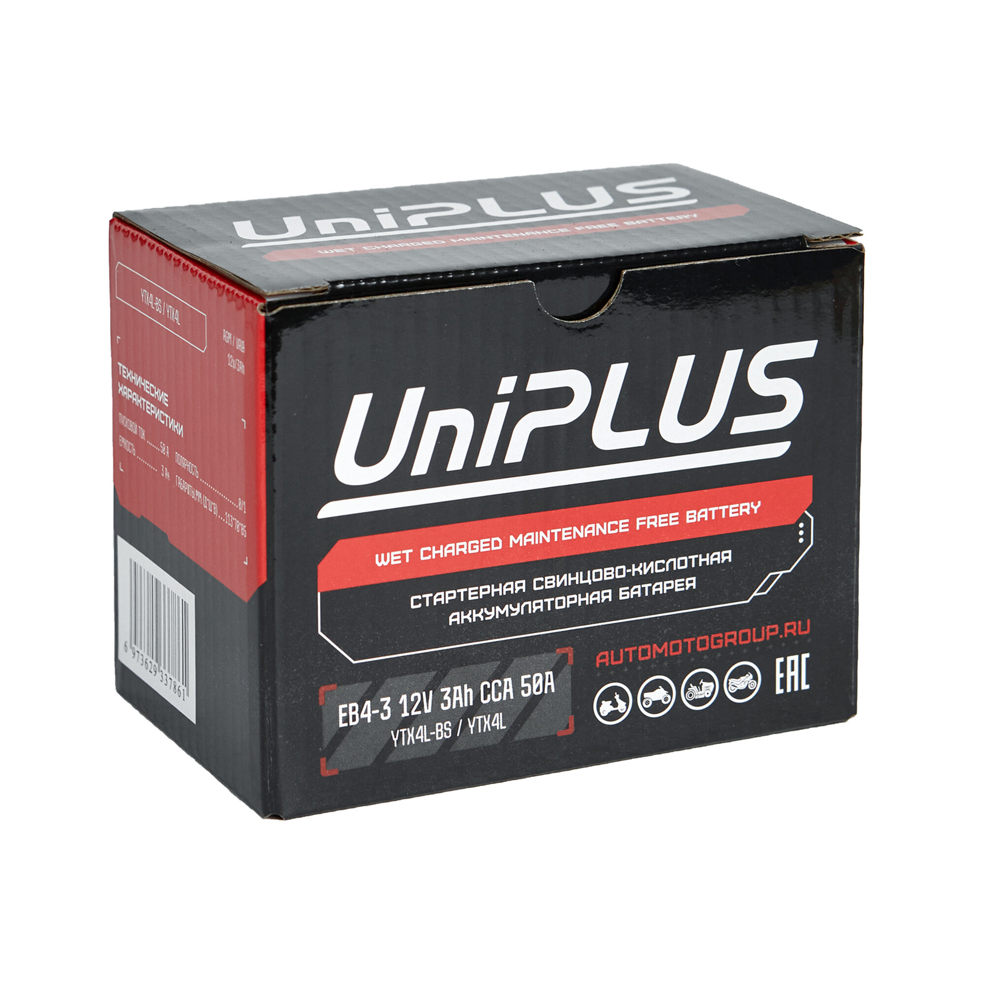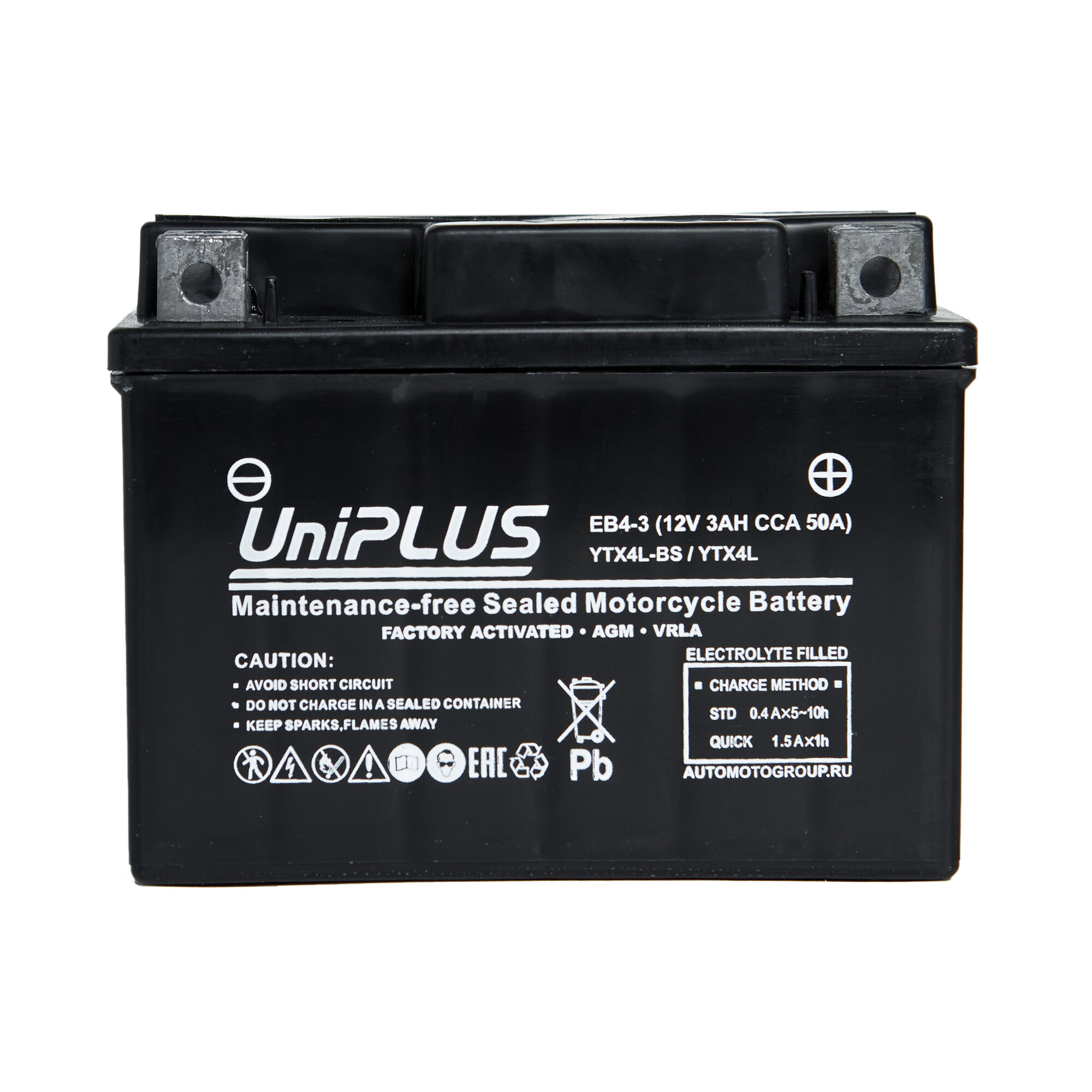 Высококачественный мото аккумулятор Leoch UniPLUS EB 4-3 (12В 3Ач 50А 113х70х85 мм, обратная полярность) совместимые модели YB4L-B; YB4L-A; YTX4L; YT4L; YTX4L-BS; Motocross M62X4B; Exide 4L-BS; Interstate CYTX4L-BS; Sears 44022; VARTA 503 014 003; Wal-mart ES4LBS; Yacht CT4L-BS. Изготовлен по технологии AGM, абсолютно виброустойчивый, с высокими пусковыми характеристиками и увеличенным до 5 лет сроком службы. В два раза быстрее принимает заряд от генератора, ударопрочный и абсолютно герметичный - безопасен, имеет усовершенствованную сульфатоустойчивость и литьевую конструкцию клемм и решеток пластин, работает в температурном диапазоне от -40С до +40С, активирован на заводе, готов к эксплуатации. Применяемость: мотоциклы, гидроциклы, квадроциклы, снегоходы, садовая и спецтехника.