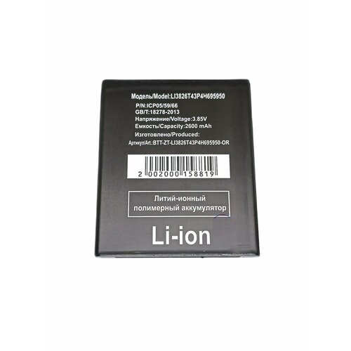 Технические характеристики аккумулятора Li3826T43P4h695950: - Тип аккумулятора: Li-Ion - Емкость: 2600 мАч - Выходное напряжение: 3.80 В - Цвет: черный