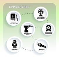 Назначение: для электроинструмента, электровелосипеда, фотокамеры, радиотелефона, ноутбука, мотоцикла, внешнего аккумулятора, видеокамеры, бытовой техники, автомобиля, ИБП, GPS-навигатора, сборки Power Bank, пультов управления, металлоискателей, фото техники, медицинского оборудования, радиоуправляемых моделей, машинок стрижки волос
