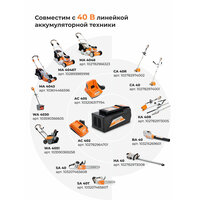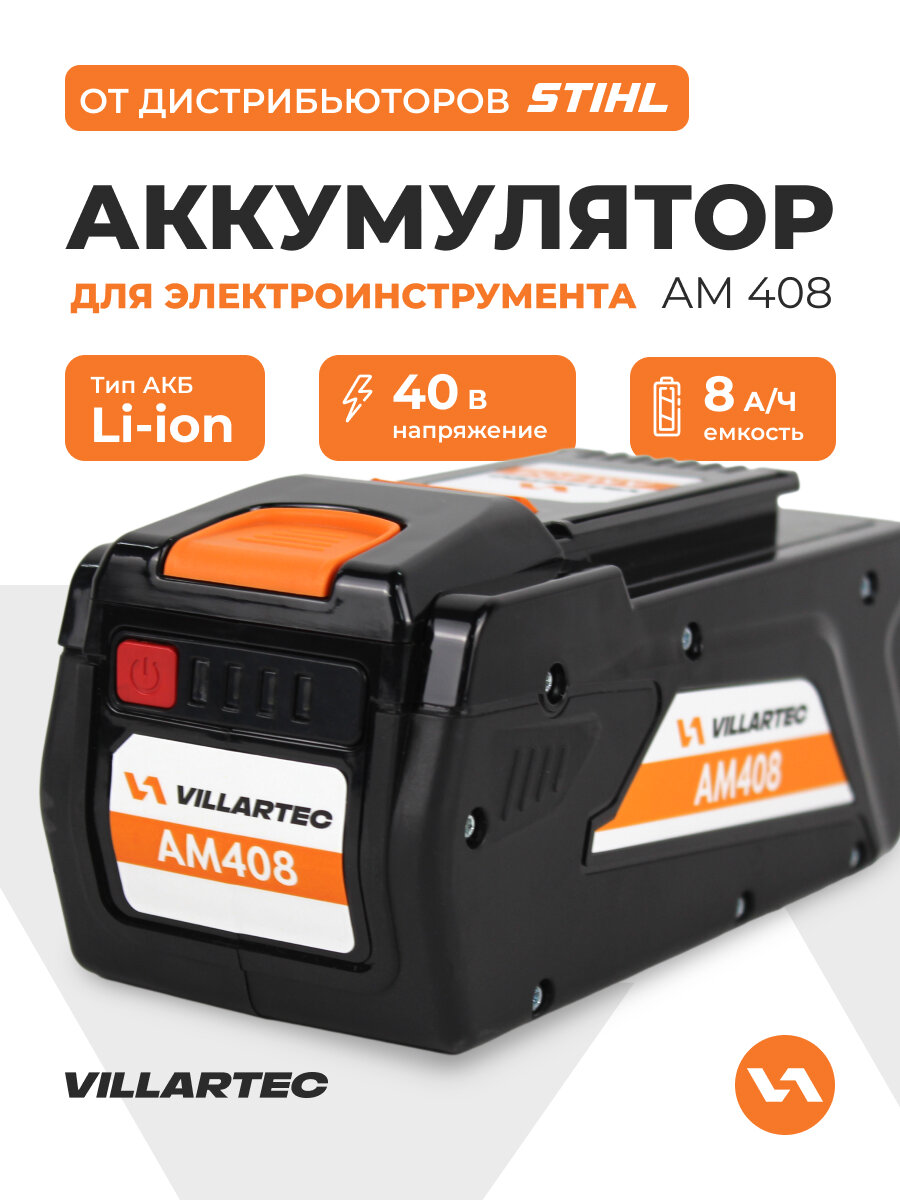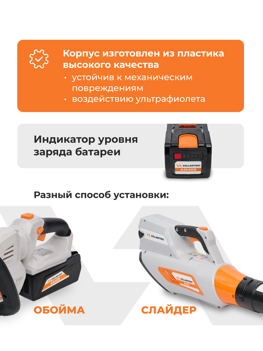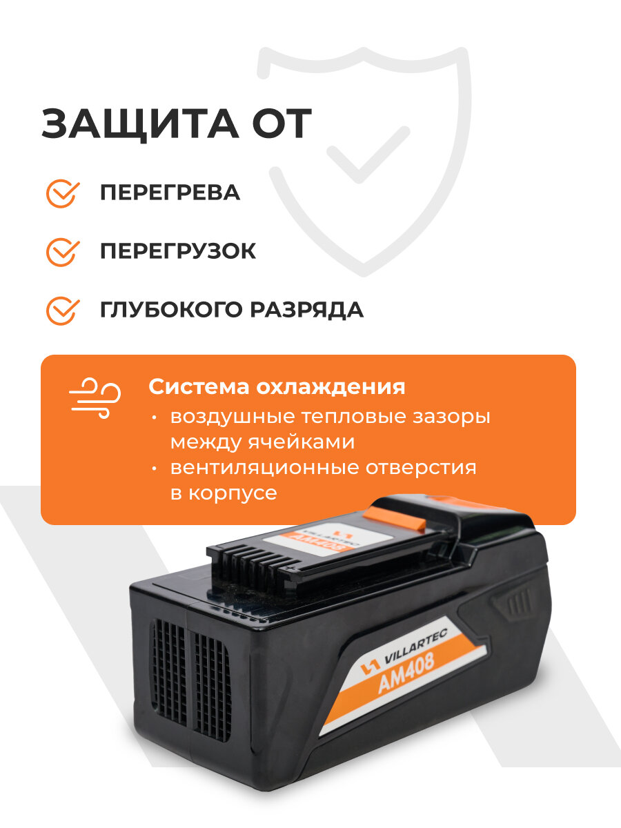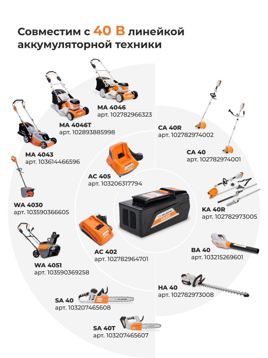 Аккумулятор сменный и совместим с аккумуляторной техникой VILLARTEC напряжением 40 В:
