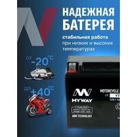 Линейка аккумуляторных батарей MYWAY отличается высокой стартовой мощностью и виброустойчивостью, имеет прочный корпус из ударостойкого пластика. Мотоаккумулятор адаптирован к российским дорогам и климату, обладая повышенной стойкостью к циклированию и вибрациям при любом стиле езды. Долговечность и повышенная энергоемкость аккумулятора мотоциклетного 12v на скутер, питбайк, генератор, квадроцикл, гарантируют их долгую бесперебойную работу.