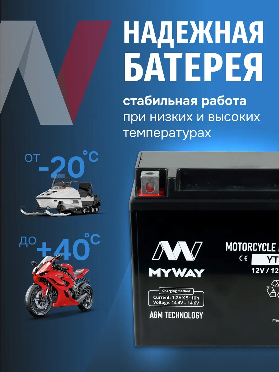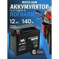 Мото аккумулятор 12 вольт 12 ампер MYWAY YTX12-BS AGM обеспечивает длительный срок службы и превосходную производительность даже в самых экстремальных условиях. Правильно подобранный акб мотоцикла 12в 12ач – гарантия длительной поездки и нормального запуска ДВС.