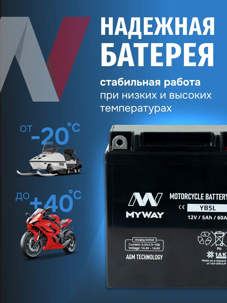Мото аккумулятор 12 вольт 5 ампер MYWAY YB5L-BS AGM обеспечивает длительный срок службы и превосходную производительность даже в самых экстремальных условиях. Правильно подобранный акб мотоцикла 12в 5ач – гарантия длительной поездки и нормального запуска ДВС.