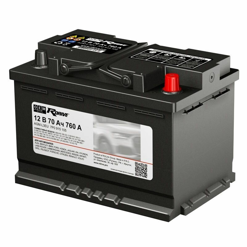 Аккумулятор RDRIVE AGM 7P0 915 105 (12В 70Ач 760А 276х175х190 мм) обратная полярность создан по AGM технологии, без жидкого электролита внутри. Невероятно выносливый, абсолютно виброустойчивый, заряд от генератора принимает в два раза быстрее обычного аккумулятора, имеет в три раза больший жизненный цикл по сравнению с обычным аккумулятором. Не боится глубоких разрядов, герметичный и абсолютно безопасный, может устанавливаться в салоне автомобиля и в багажнике. Для авто с системой Старт-Стоп, с высоким энергопотреблением. JAGUAR: AH 5 210 655 AB / LR 032 876 / T2 H3 716. LAND ROVER: AH 5 210 655 AB / LR 032 876. VAG: 000 915 105 CD / 3 D0 915 105 H / 5 GM 915 105 AB / 958 61 107 521. PORSCHE: 5 GM 915 105 AB / 958 61 107 521. Применяемость: AUDI: A1 / A3 / A4 / A5 / A6 / A7 / ALLROAD / Q3 / Q5 / Q7 / R8 / TT. BMW: 1 / 2 / 3 / X1 / X3 / X5 / Z4 ROADCOASTER. CADILLAC: ATS / CTS. HYUNDAI: i40 / ix35 / SANTA FÉ III /TUCSON. JAGUAR: S-TYPE / XF / XJ / X8. KIA: OPTIMA / SPORTAGE. LAND ROVER: DISCOVERY SPORT / FREELANDER 2 / RANGE ROVER EVOQUE. MERCEDES-BENZ.