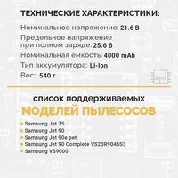 Аккумулятор VCA-SBT90 для пылесоса Samsung Jet 90 / Jet 75 / Jet 90E 21.6В 4000мА*ч: сравнение цен, характеристики, фото, актуальное наличие и цены.