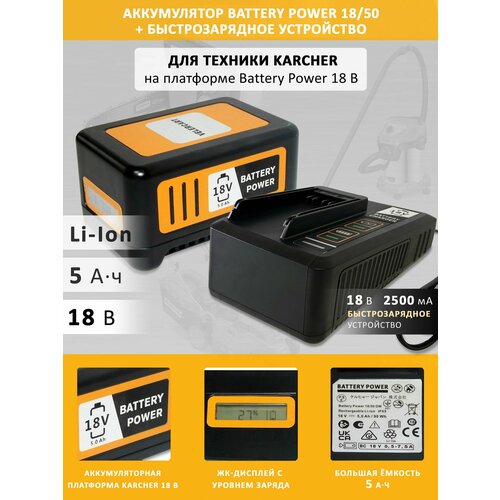 Аккумулятор VELERCART Battery Power 18/50 для техники Karcher (2.445-035.0). Подходит ко всем аппаратам Karcher на аккумуляторной платформе Battery Power 18 В (пылесосы, садовая техника, минимойки и и т. п.). В комплекте мощное зарядное устройство 18 В, 2500 мА.