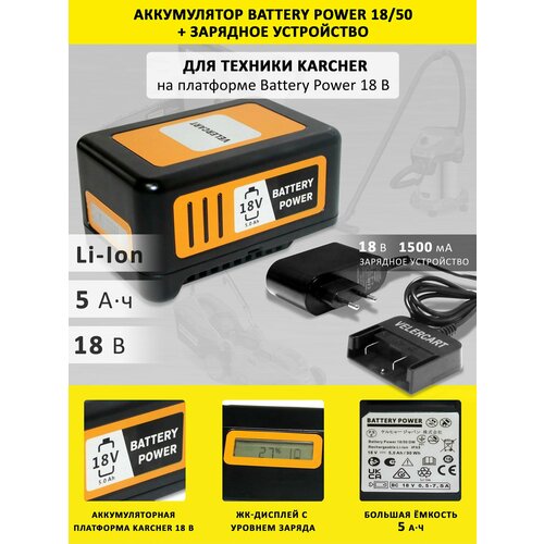 Аккумулятор VELERCART Battery Power 18/50 для техники Karcher (2.445-035.0). Подходит ко всем аппаратам Karcher на аккумуляторной платформе Battery Power 18 В (пылесосы, садовая техника, минимойки и и. п.). В комплекте мощное зарядное устройство 18 В, 1500 мА.