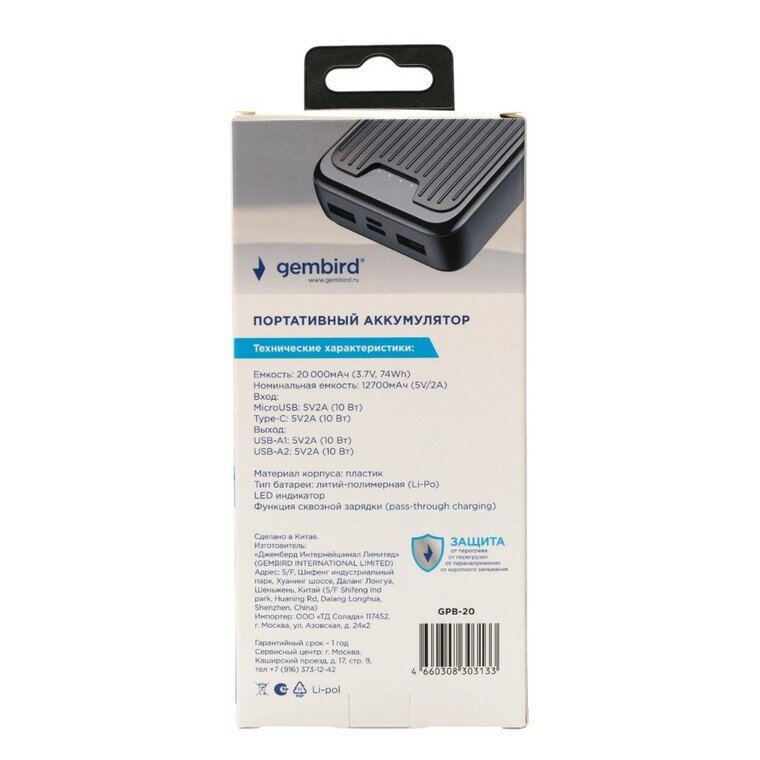 Купить Аккумулятор внешний Gembird GPB-20 20000 мАч, 2 А, micro USB/USB 2.0/USB Type-C (GPB-20) с доставкой по всей России.