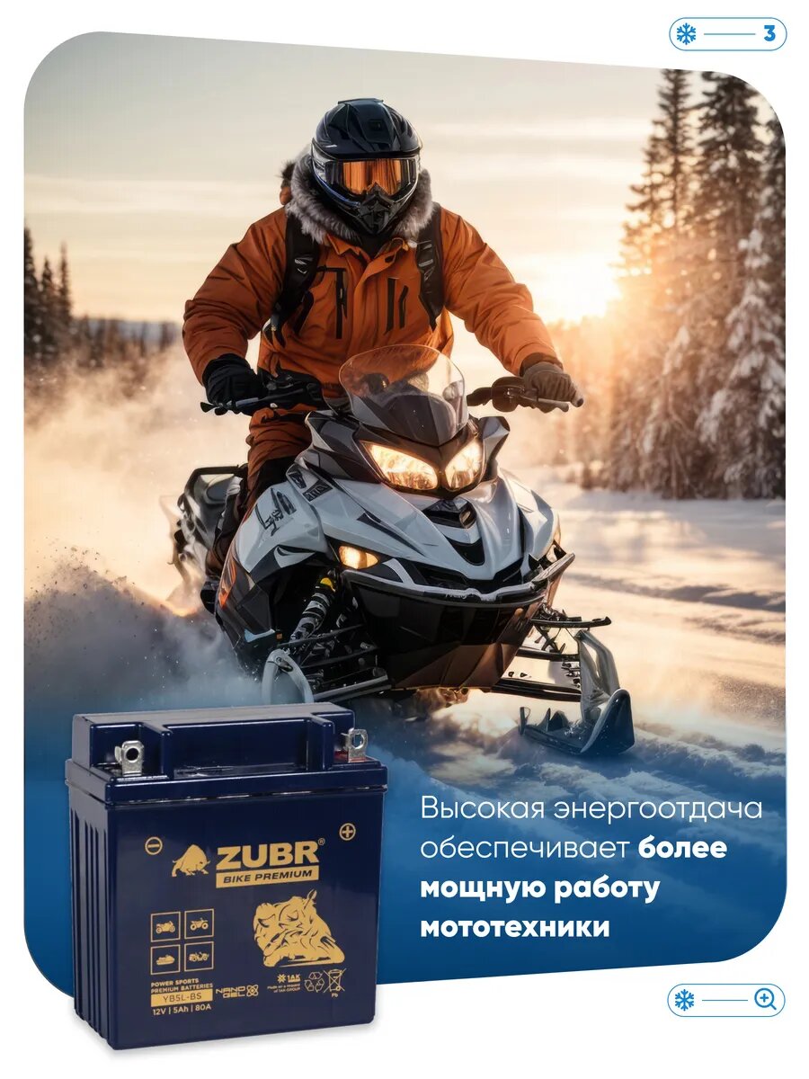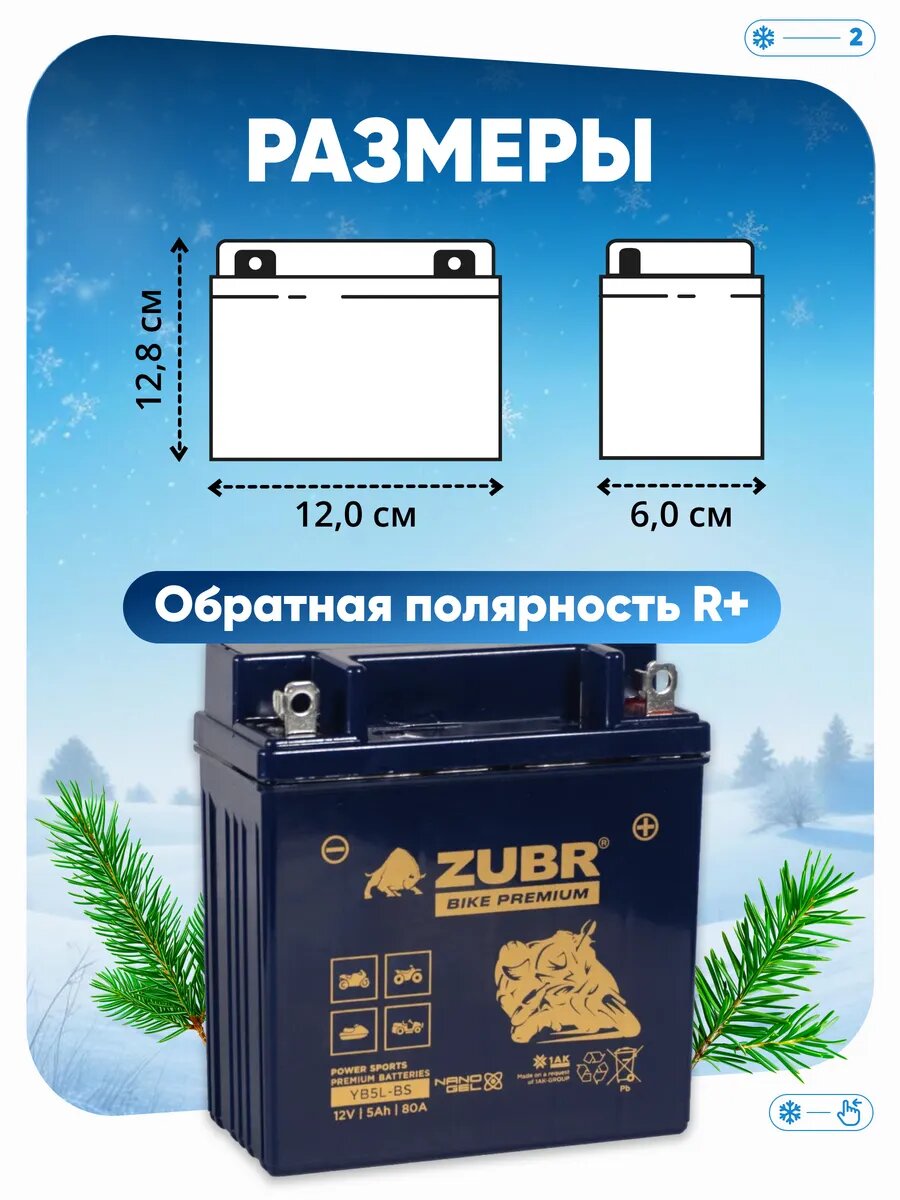 Мото аккумулятор 5 ач ZUBR PREMIUM YB5L-BS(GEL) (оем номера СТ 1205.1; 12N5-3B; 12N5-3B-Gel; LT5А-3-1; CB5L-B; YB5L-B; DB5L-B) гарантирует длительный срок службы и превосходную производительность даже в самых экстремальных условиях. Для того, чтобы получить истинное удовольствие от скорости и качества езды, у мотоцикла должен быть не только мощный двигатель, но также и надежный аккумулятор. Правильно подобранный акб на мотоцикл – гарантия длительной поездки и нормального запуска ДВС. Линейка аккумуляторных батарей ZUBR отличается высокой герметичностью и вибростойкостью, имеет прочный корпус из ударостойкого пластика. Долговечность и высокая энергоемкость аккумулятора мотоциклетного 12v гарантируют долгую бесперебойную работу мотобайка. Аккумуляторы для мотоцикла гелевые 12в обладают высокой стартовой мощностью и повышенной энергоотдачей, являются универсальными, подходят для пуска двигателей мототехники: мотоцикл альфа, урал, электро мопед, иж планета юпитер, скутер электрический китайский, гидроцикл, квадроцикл, снегоход, снегоуборщик, снегоочиститель, багги, мотовездеход, питбайк 125, пит байк, трицикл, электротрицикл, мотособака, мотобуксировщик, снегоуборщик, бензо генератор. Аккумулятор мото 12 вольт на альфу GEL отличается стойкостью к глубокому разряду и воздействию низких температур, является необслуживаемым. Мото аксессуары эндуро мужские имеют высокий показатель пускового тока и срок службы более пяти лет. Основные преимущества аккумулятора для мопеда альфа: полностью герметичная конструкция, не допускающая утечку электролита; система внутренней рекомбинации газа акб для скутера 12 в исключает необходимость долива дистиллята; повышенные стартовые характеристики; высокая устойчивость к циклированию, вибрациям при любом стиле езды; адаптированы к российским дорогам и климату. Перед покупкой мототовара узнайте размеры посадочного места. Мотоаккумулятор Зубр прост в установке, может работать в любом положении и позволяет быть уверенным в надежном запуске.