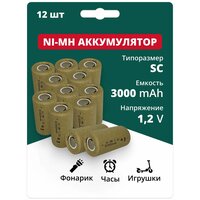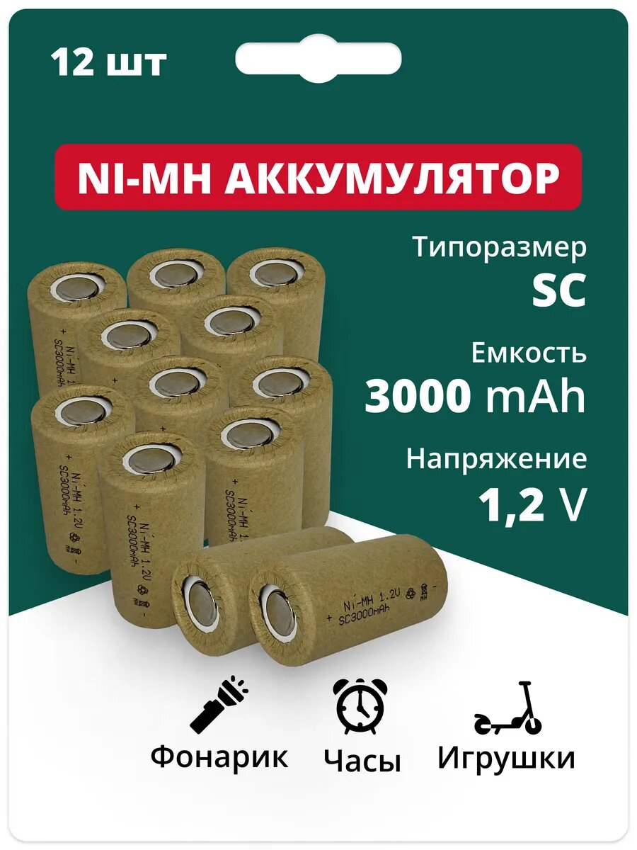 Комплект 12шт. Аккумуляторные батарейки Ni-Mh типоразмера SC широко применяются в электроиструменте (гайковерты, отвертки, шуруповерты, дрели и тд) известных брендов, как: Bosch, Makita, Dewolt, Black Deker, Hitachi, AEG, Интерскол и др. Также имеют популярность в АКБ для медицинского оборудования и бытовой техники. Данный аккумулятор может заменить Ваш старый с меньшей емкостью, если типоразмер совпадает. Большое количество циклов - около 1000 заряд/разряд, большой срок службы, низкая скорость саморазряда, низкое внутреннее сопротивление. Тип: Ni-Mh SC Напряжение: 1.2В Емкость: 3000мАч Габариты: 23х42 (диаметр х высота) Максимальный ток разряда: 10С (20А) Допустимая температура при заряде: от 0 до 45℃ Допустимая рабочая температура: от -10 до 50℃ Тип контакта: плоский