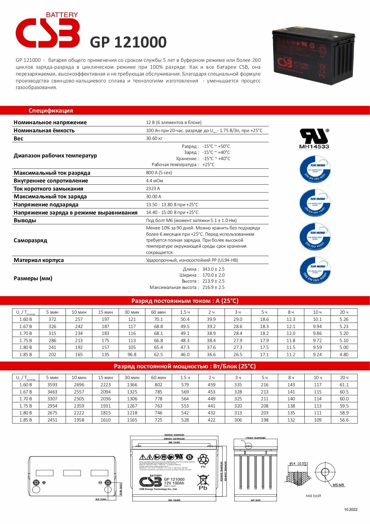 GP 121000 - батарея общего применения со сроком службы 5 лет в буферном режиме или более 260 циклов заряда-разряда в циклическом режиме при 100% разряде. Как и все батареи CSB, она перезаряжаемая, высокоэффективная и не требующая обслуживания.