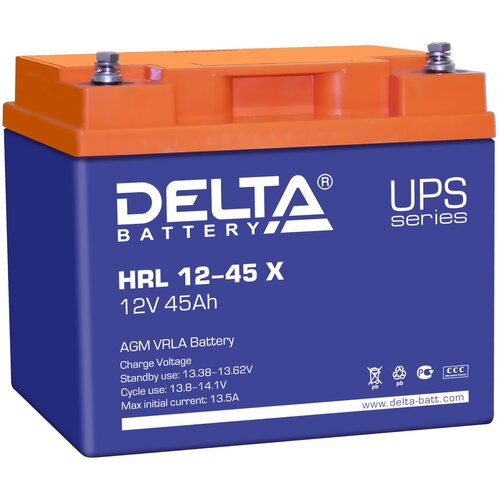 Delta HRL 12-45 X – это обновленный в 2018 году выпускавшийся с 2003 года аккумулятор Delta HRL 12-45 из серии аккумуляторов Delta HRL (UPS Series). Аккумулятор сменил цвет с оранжевого на синий и в маркировке получил дополнительный индекс «X». Герметизированный VRLA cвинцово-кислотный аккумулятор Delta HRL 12-45 X напряжением 12В и емкостью 45Ач изготовлен по технологии AGM (с микропористым заполнителем, пропитанным электролитом). Корпус изготовлен из негорючего ABS пластика. Срок службы аккумулятора достигает 12 лет. Аккумулятор относится к линейке DELTA UPS series и предназначен для работы в системах бесперебойного питания (ИБП), системах связи, ЦОД. Обладает низким внутренним сопротивлением и высокой плотностью энергии.