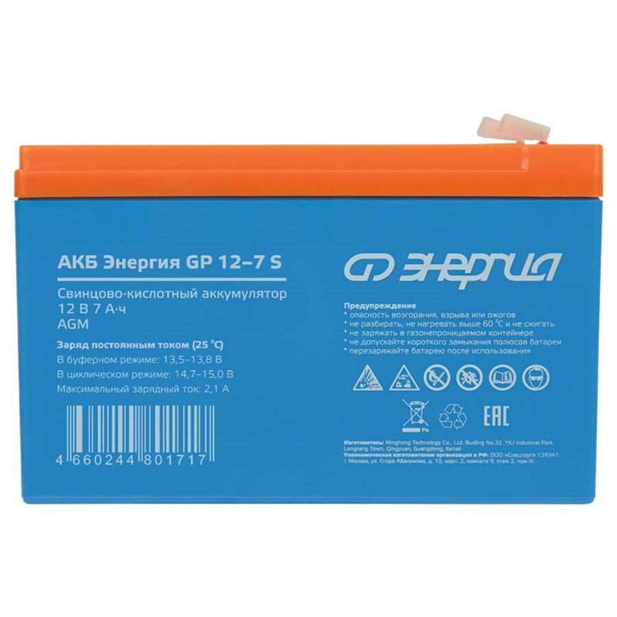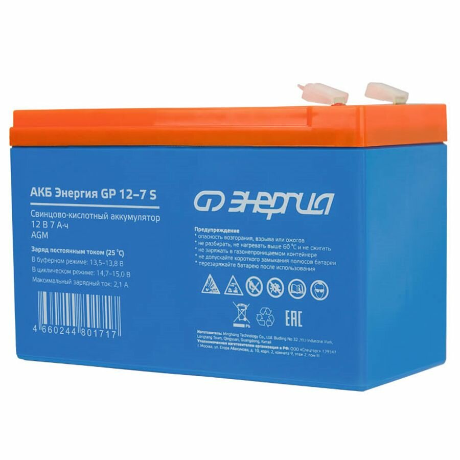 Аккумуляторная батарея Энергия АКБ GP 12-7 S, изготовлена по технологии AGM и предназначена для эксплуатации в буферном режиме в устройствах бесперебойного электропитания устройств охранной и пожарной сигнализации, информационных и телекоммуникационных систем и других типов оборудования, при работе которых не допускается перерывов в электропитании. Преимущества: Герметичная конструкция, предотвращающая утечку кислотыМожно использовать в жилых помещенияхНе требуют обслуживанияСтабильная работа при больших нагрузкахУстойчивы к разряду ниже 40 %Низкий саморазряд