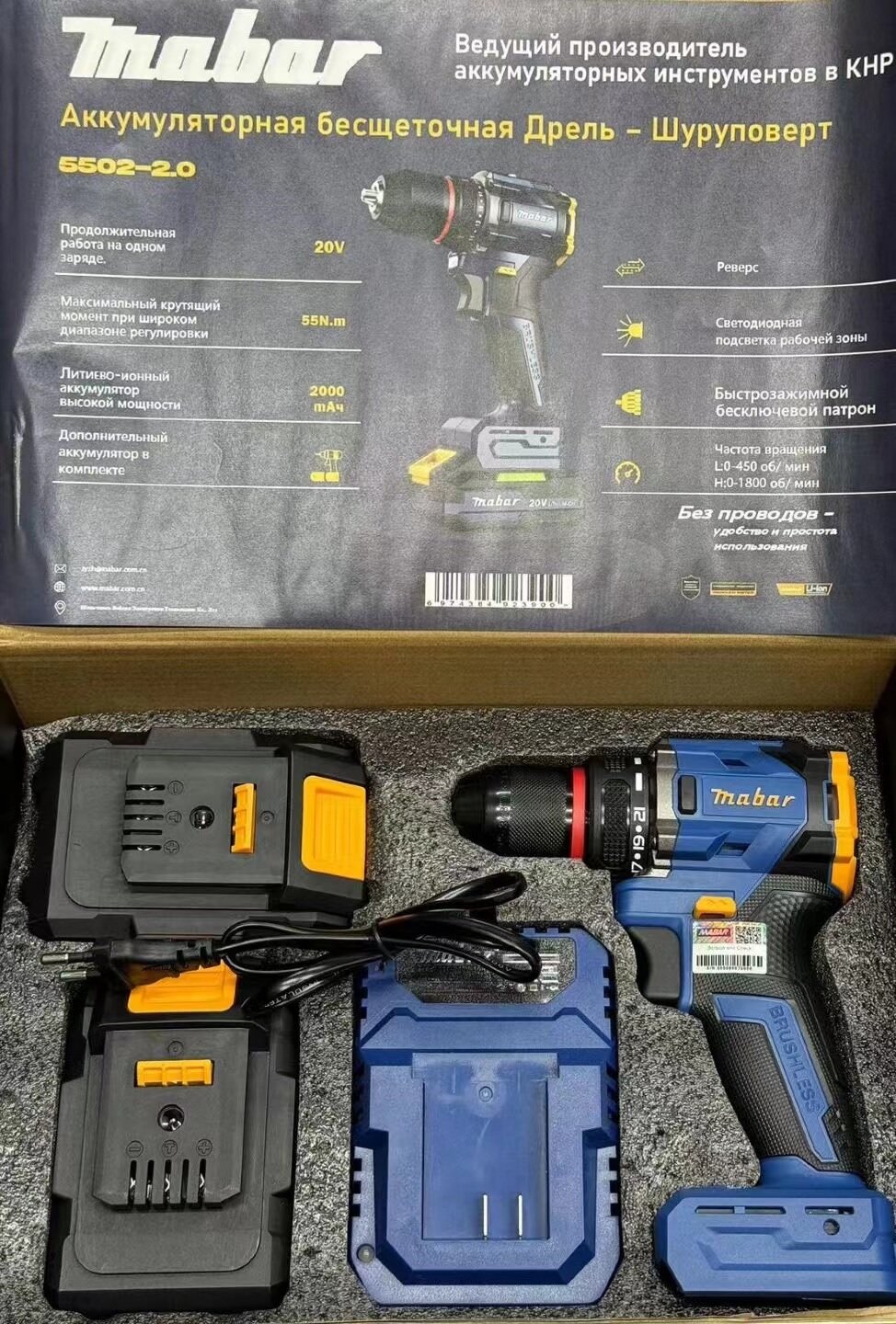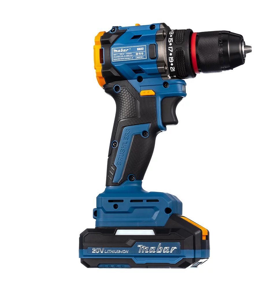 Купить Аккумуляторная бесщеточная дрель-шуроповерт Mabar 5502-2.0 с крутящим моментом 55Нм, 20 Вольт, 2 аккумулятора по 2 А/ч с доставкой по всей России.