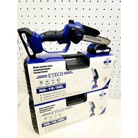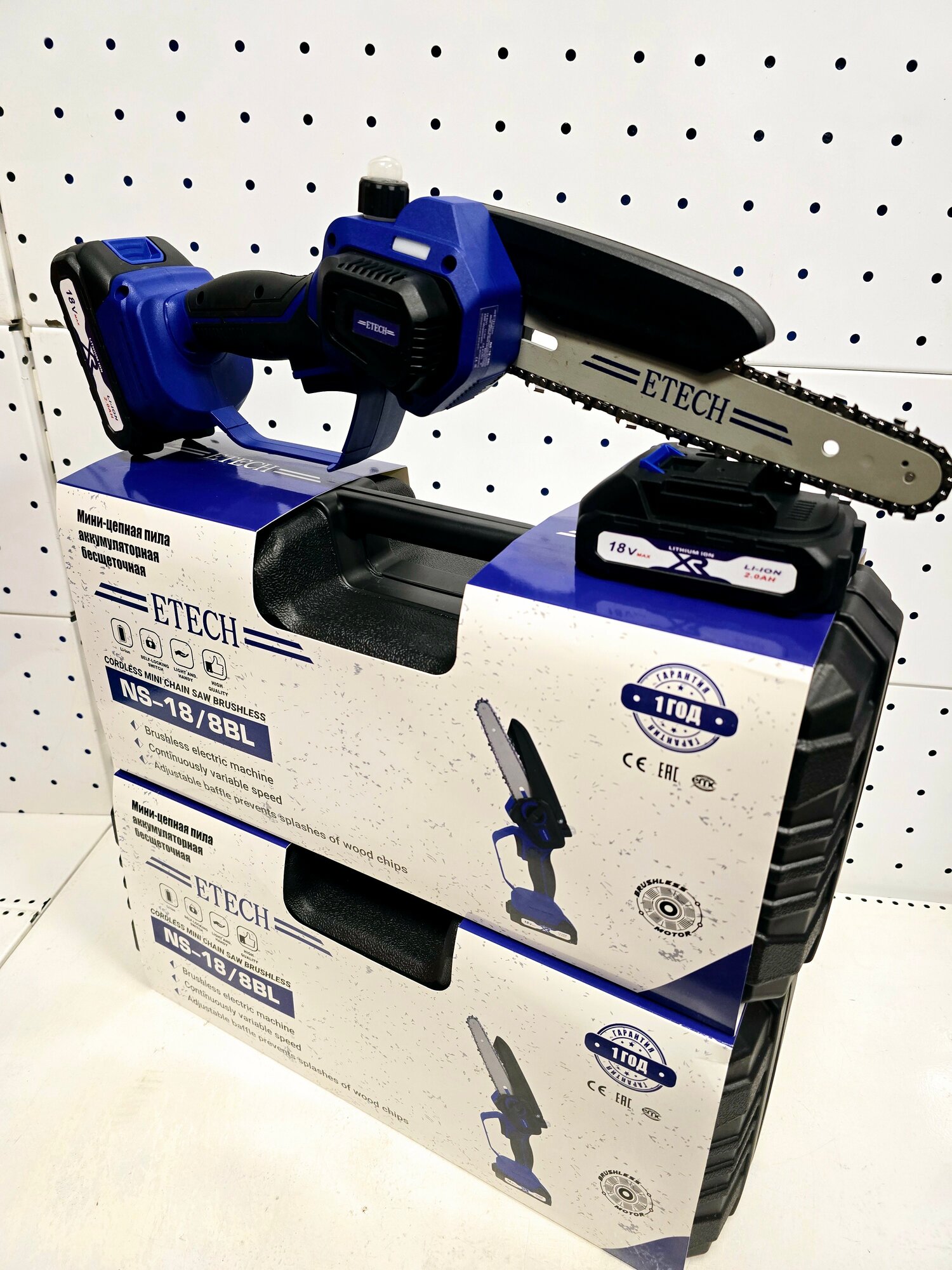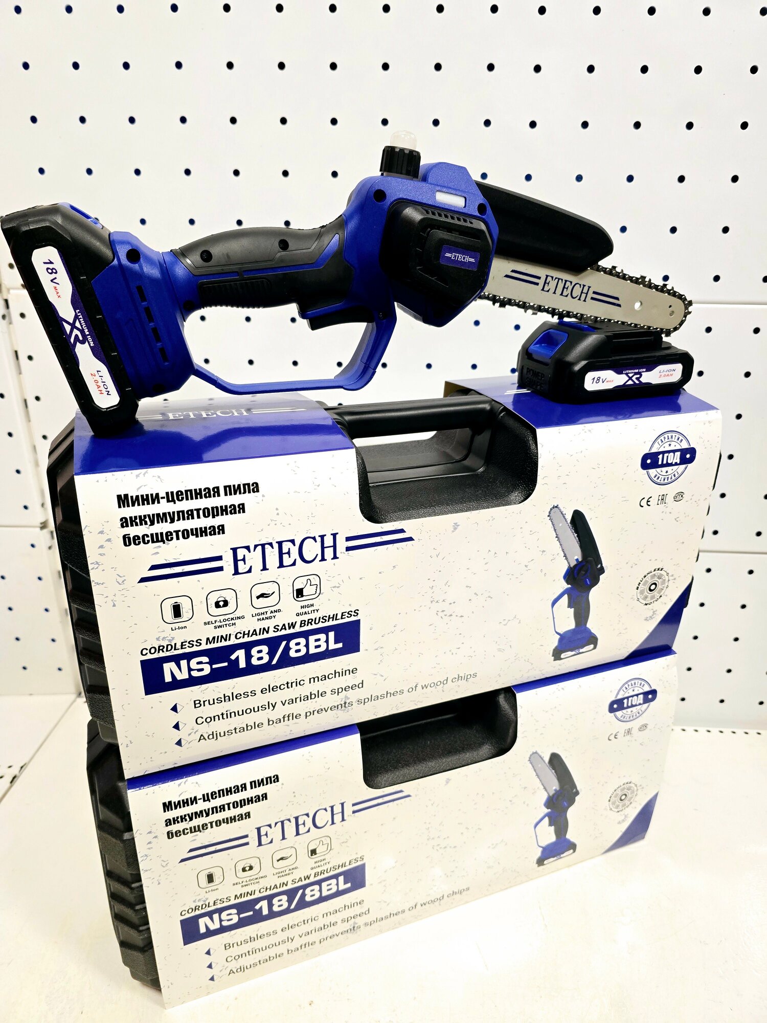 Аккумуляторная бесщеточная мини-пила цепная Etech NS-18/8BL (21В, 0-4000 об/мин, 2шт акб Li-ion, кейс, шина 8″, 2 цепи): сравнение цен, характеристики, фото, актуальное наличие и цены.