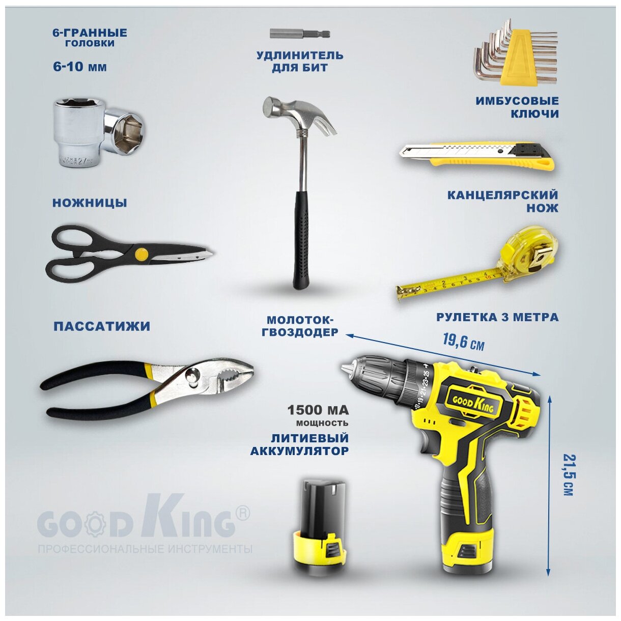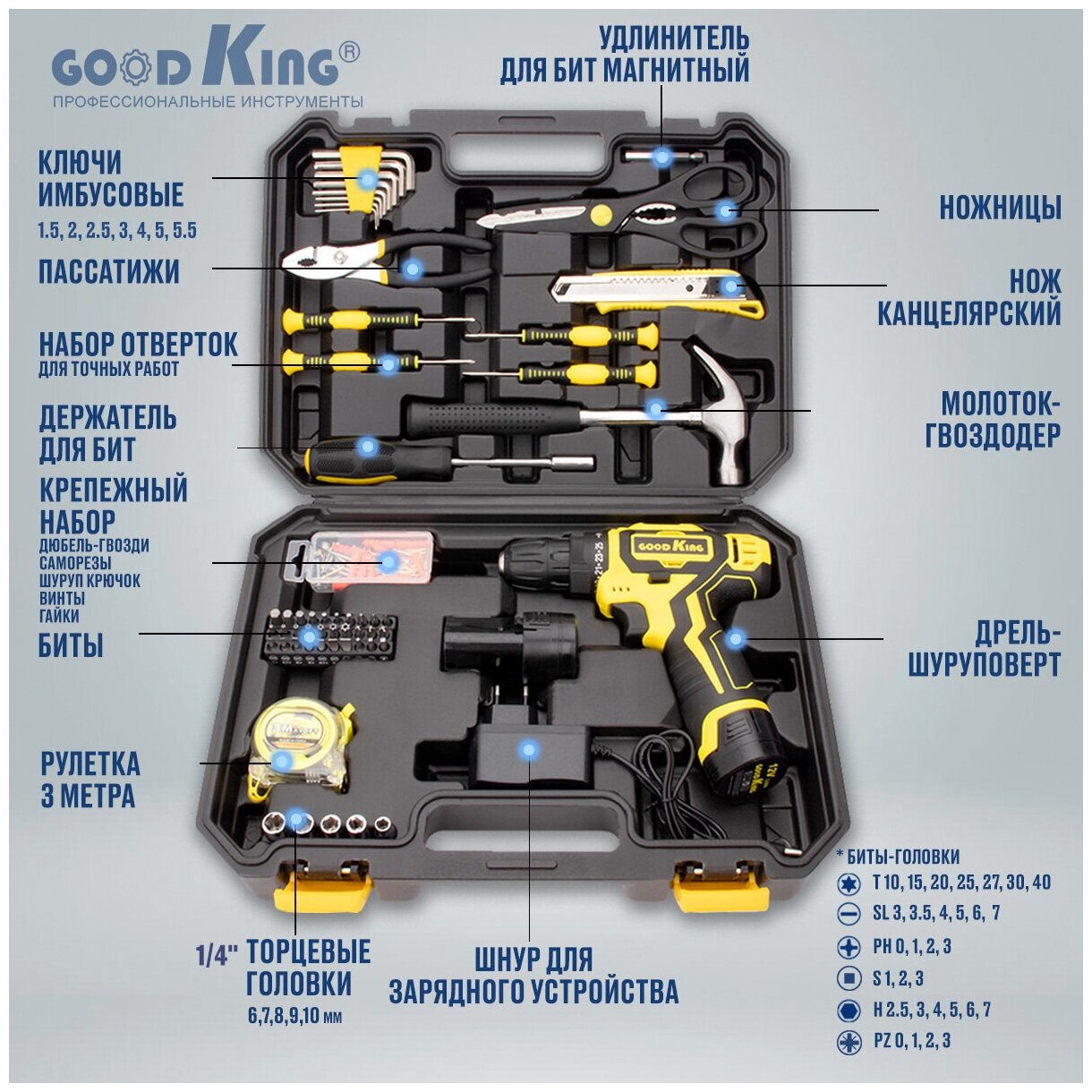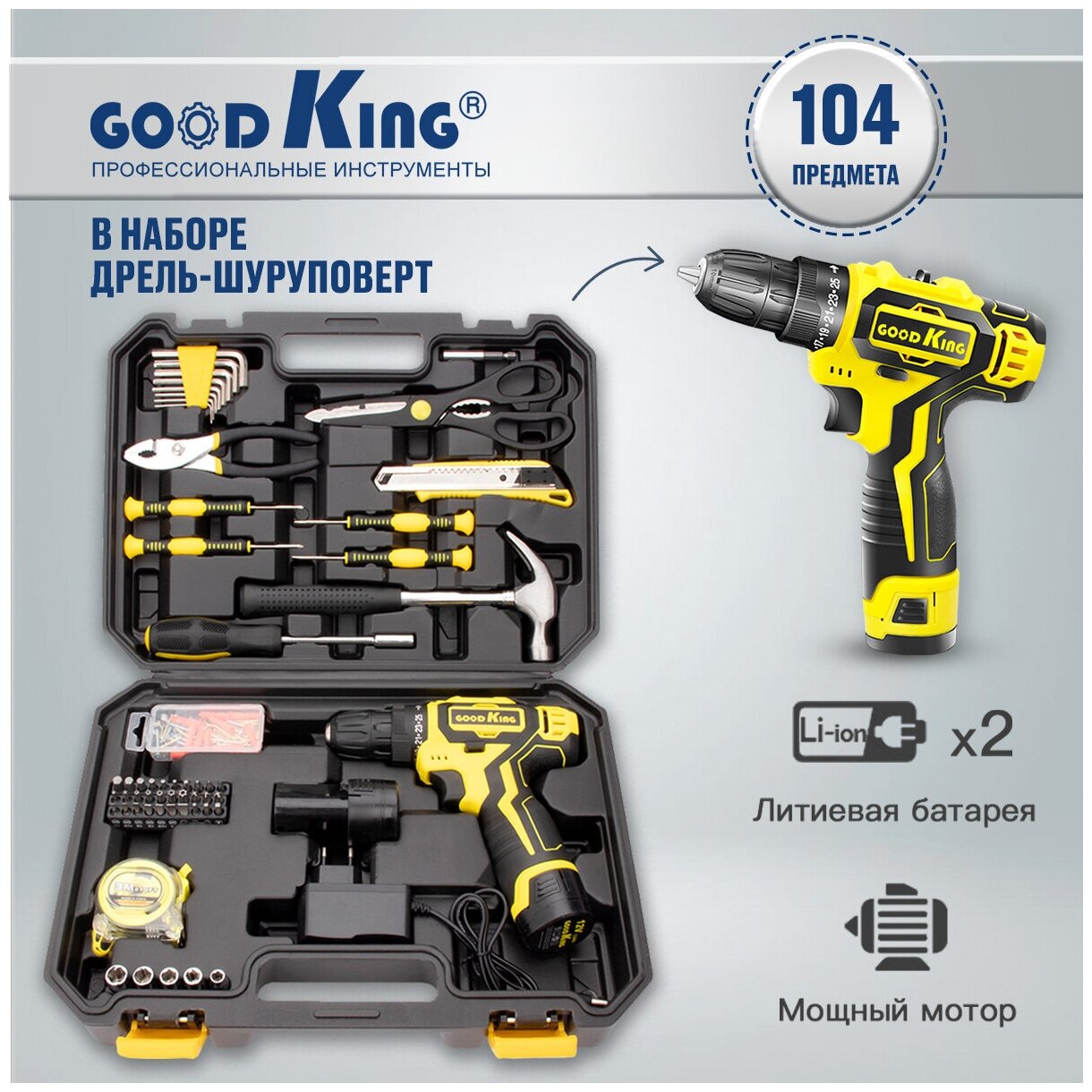 Аккумуляторная дрель-шуруповерт 2 акб 12В. 1.5Ач, 20Нм GOODKING EC-1202104, набор инструментов для ремонта: сравнение цен, характеристики, фото, актуальное наличие и цены.