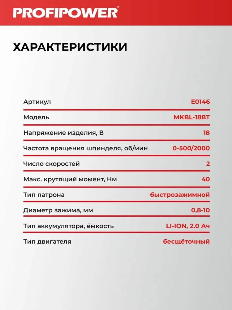 Аккумуляторная дрель-шуруповерт бесщёточный PROFIPOWER MKBL-18BT (18В Li-ion 2 шт 2,0 Ач кейс): сравнение цен, характеристики, фото, актуальное наличие и цены.