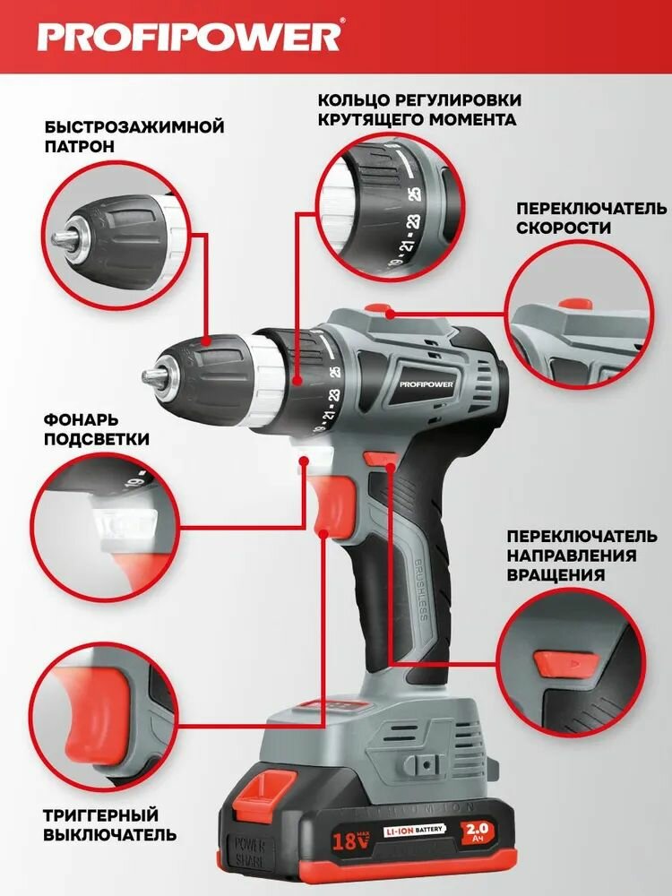 Купить Аккумуляторная дрель-шуруповерт бесщёточный PROFIPOWER MKBL-18BT (18В Li-ion 2 шт 2,0 Ач кейс) с доставкой по всей России.