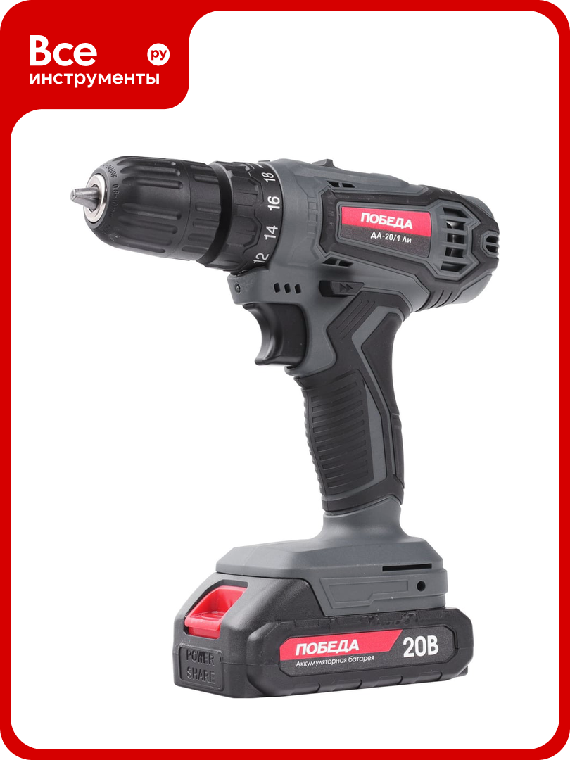 Аккумуляторная дрель-шуруповерт победа ДА-20/1 Ли, 20В, 2,0Ач, 1 АКБ, 38Нм, кейс 180201700: сравнение цен, характеристики, фото, актуальное наличие и цены.