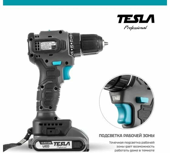 Аккумуляторная дрель Tesla TCD14BL 14.4 В, 2×2.0 Ач, LiION, 10 мм, 0-400/0-1500 об/мин, 48 Нм, 1 ч, кейс 840368
