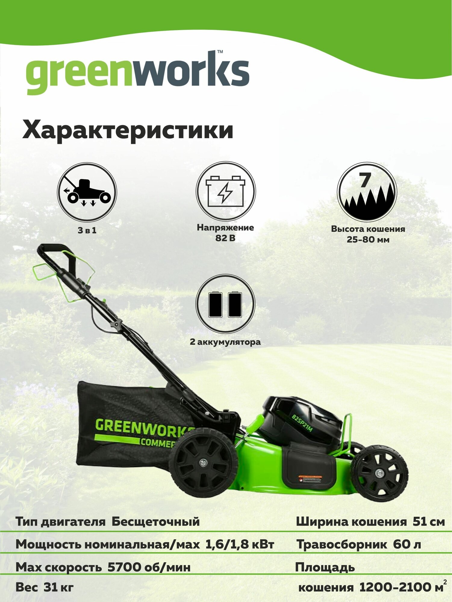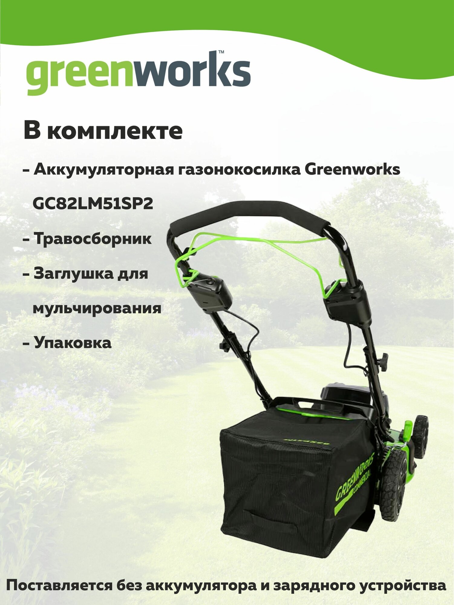 Купить Аккумуляторная газонокосилка Greenworks GC82LM51SP2 Без АКБ и без ЗУ с доставкой по всей России. Аккумуляторная газонокосилка Greenworks GC82LM51SP2 Без АКБ и без ЗУ: сравнение цен, характеристики, фото, актуальное наличие и цены.
