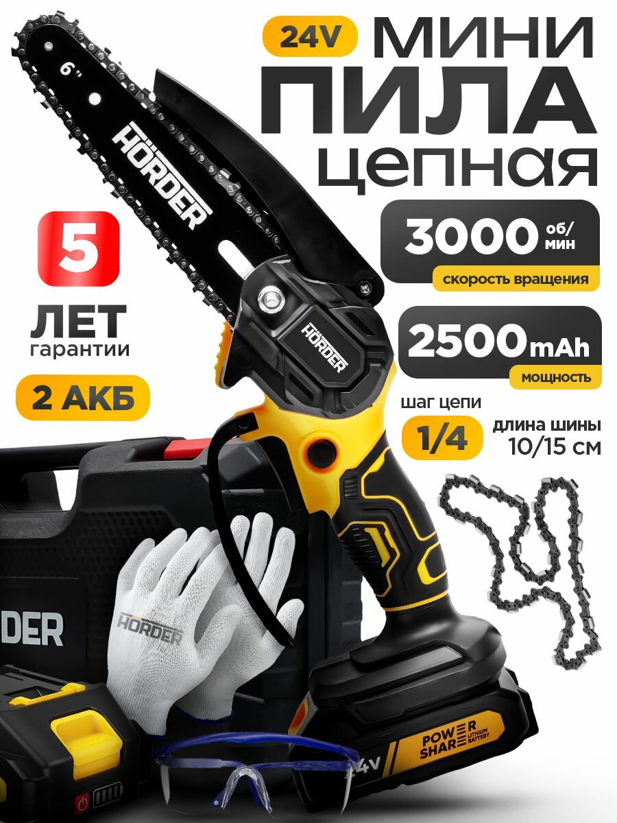 Аккумуляторная мини пила HORDER 24В, 2500 мАч, шина 10/15 см, 2 АКБ, цепная, для дачи и сада: сравнение цен, характеристики, фото, актуальное наличие и цены.