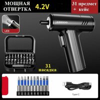 | Комплектация | упаковка -1шт. Аккумуляторная отвёртка-1шт. USB провод для зарядки-1шт. Биты - 2 шт. набор бит 31 шт. в кейсе на пояс - 1 шт. |