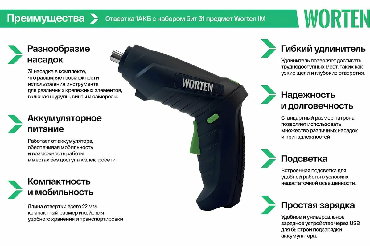 Аккумуляторная отвертка WORTEN 4В, 1АКБ, 1,3 Ач, с набором бит 31 предмет КА-90000327: сравнение цен, характеристики, фото, актуальное наличие и цены.