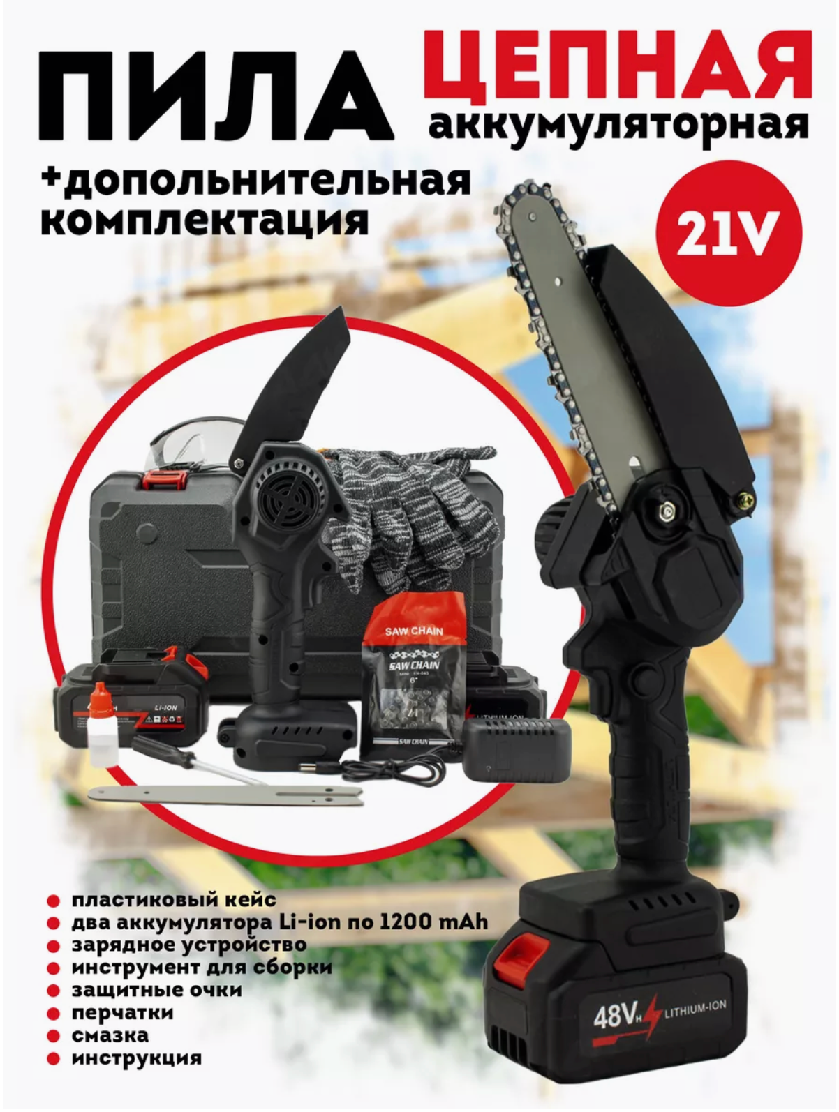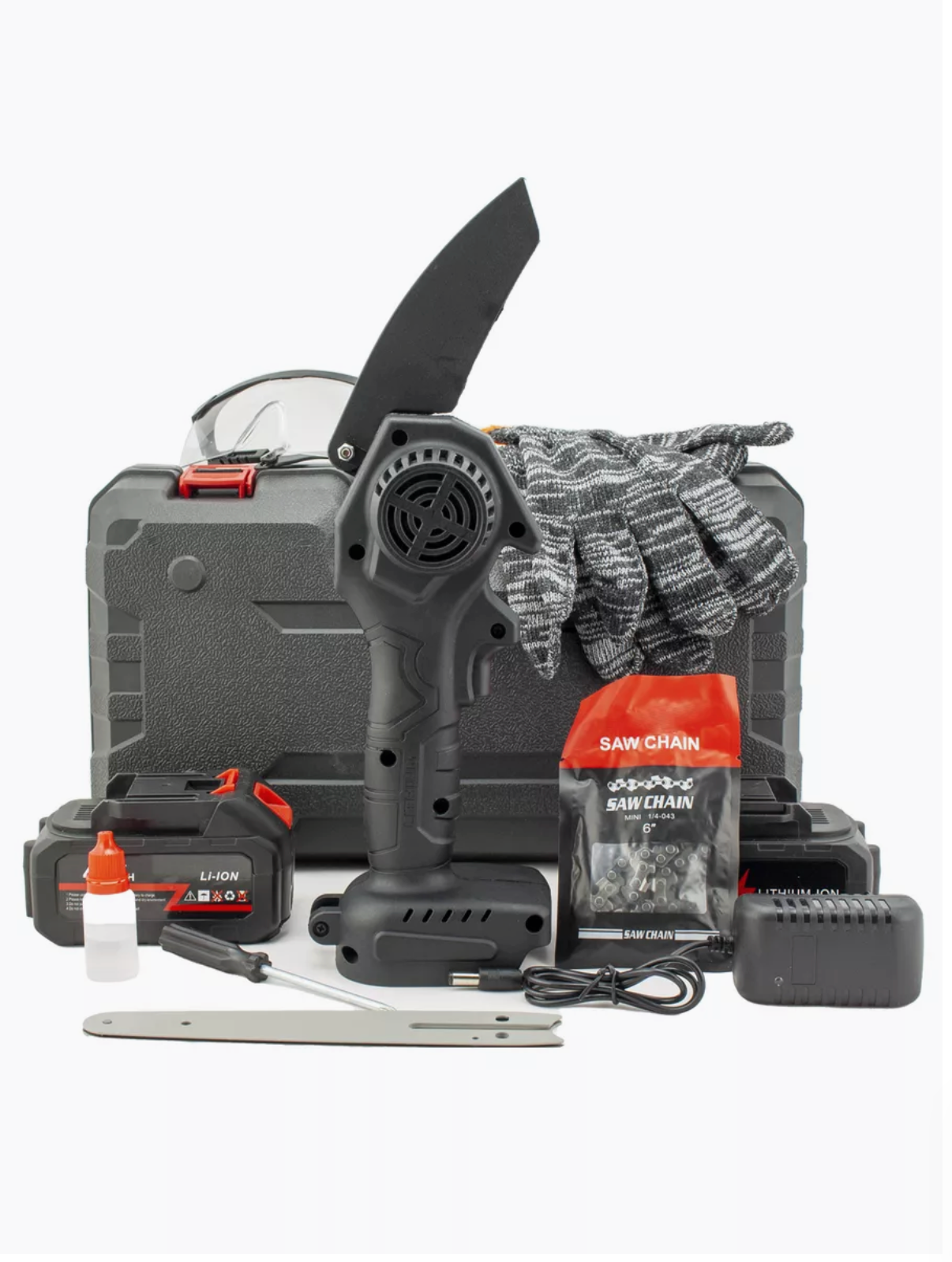 Кейс; Аккумуляторная цепная пила; Аккумулятор - 2шт; Цепь; Шина; Набор для сборки; Блок питания; Защитные очки; Перчатки; Смазка для цепи