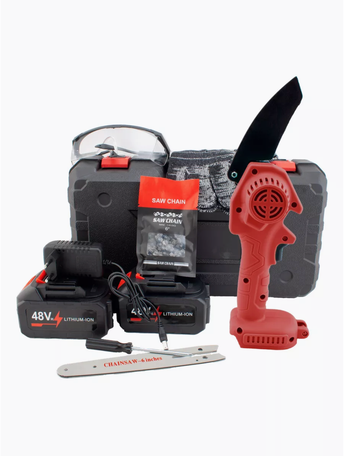 Кейс; Аккумуляторная цепная пила; Аккумулятор - 2шт; Цепь; Шина; Набор для сборки; Блок питания; Защитные очки; Перчатки; Смазка для цепи