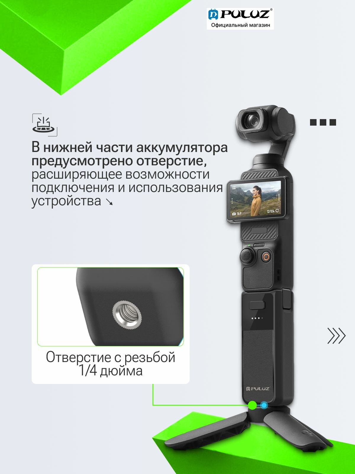 Аккумуляторная ручка для DJI Osmo Pocket 3 – это не только функциональность, но и стиль. Эргономичный дизайн делает работу с устройством более комфортной, а также придает вашему гаджету современный вид. Инвестируйте в свой опыт съемки и наслаждайтесь любыми приключениями без ограничений.