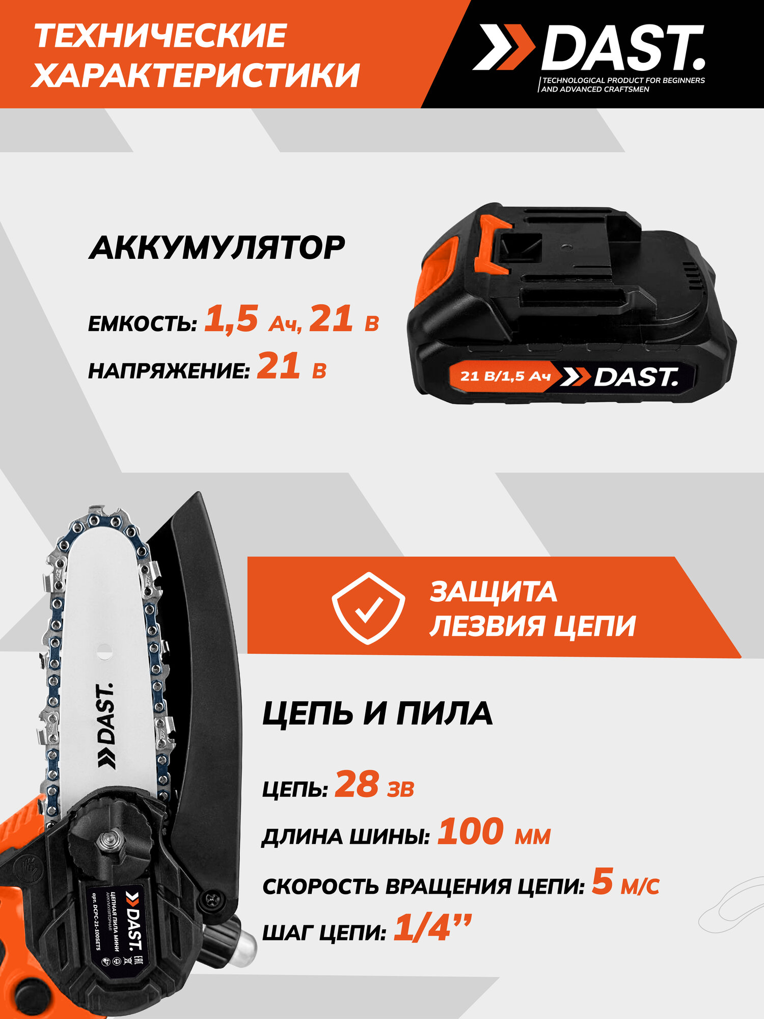 Аккумуляторная цепная мини-пила DAST 21 В (DCPC-21-100SET5) – это компактный и мощный инструмент с аккумулятором 21 В, 1,5 А·ч, предназначенный для подрезки сучьев, распила небольших деревьев и садовых работ на даче или придомовой территории, оснащенный шиной 100 мм, цепью на 28 звеньев с шагом 1/4’’ и скоростью вращения 5 м/с; благодаря эргономичному дизайну, индикатору заряда, износостойкой цепи, надежному щеточному двигателю и защите лезвия, пила удобна для работы одной рукой, проста в обслуживании и безопасна в хранении, поставляется в практичном кейсе с зарядным устройством, двумя цепями и шиной, а гарантия 12 месяцев подтверждает ее надежность.