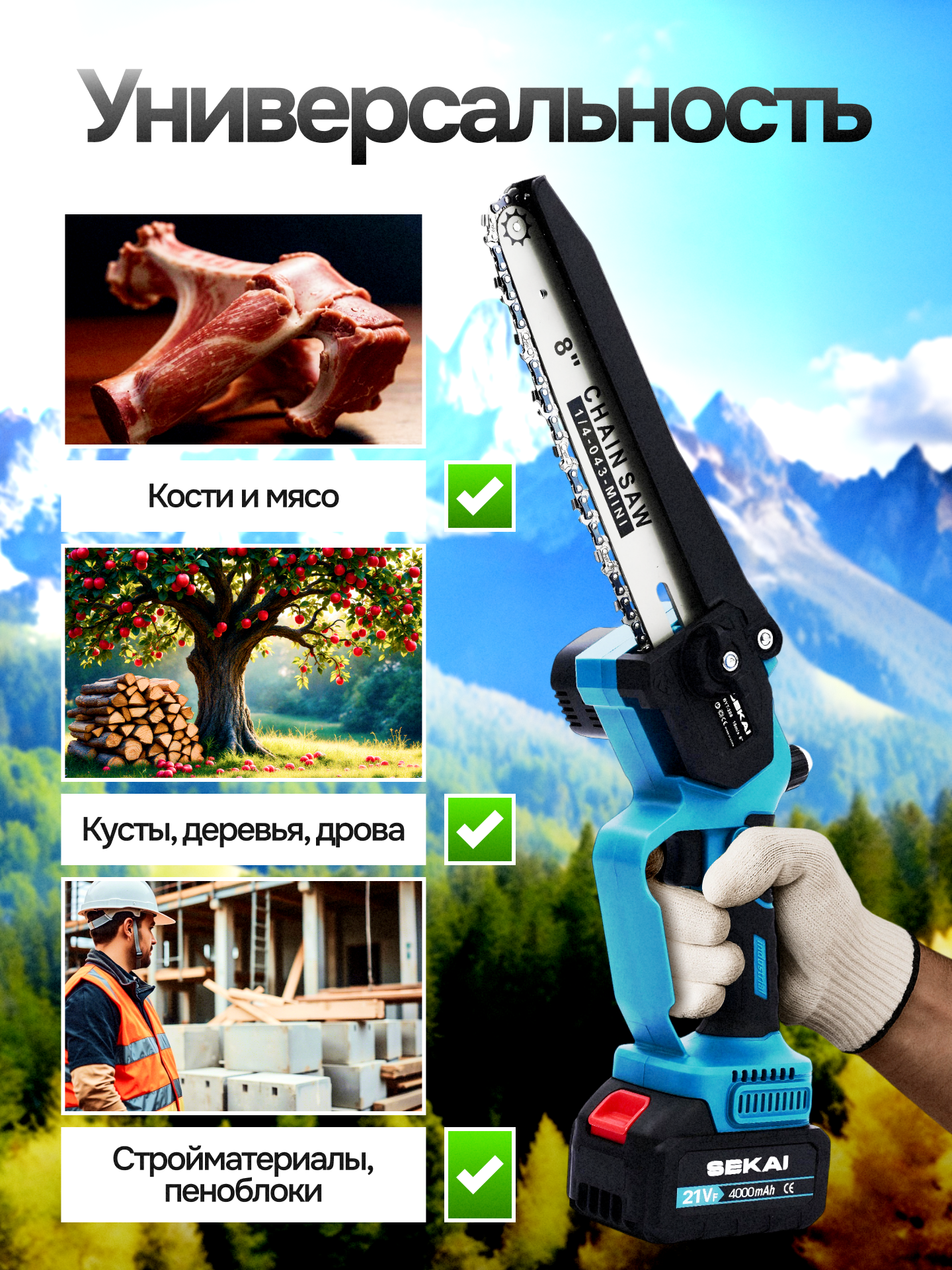 Представляем вашему вниманию незаменимого помощника — пилу, которая работает от аккумулятора. Она станет вашим верным союзником как в садовых, так и в строительных проектах. Этот инструмент создан специально для тех, кто ценит мощность, надежность и независимость от розетки. Она выполнит роль электроножовки, электросучкореза и кустореза.