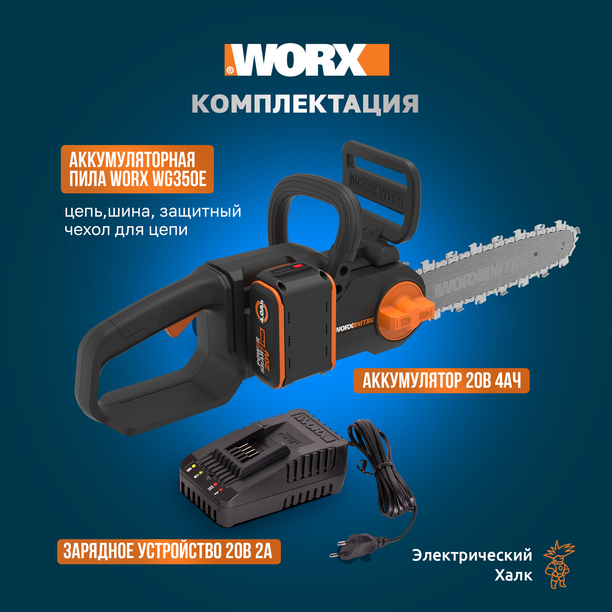 Купить Аккумуляторная цепная пила с бесщёточным мотором и автосмазкой Worx Nitro WG350E, 20В, 30 см, АКБ 4Ач + ЗУ 2А с доставкой по всей России. Аккумуляторная цепная пила с бесщёточным мотором и автосмазкой Worx Nitro WG350E, 20В, 30 см, АКБ 4Ач + ЗУ 2А: сравнение цен, характеристики, фото, актуальное наличие и цены.