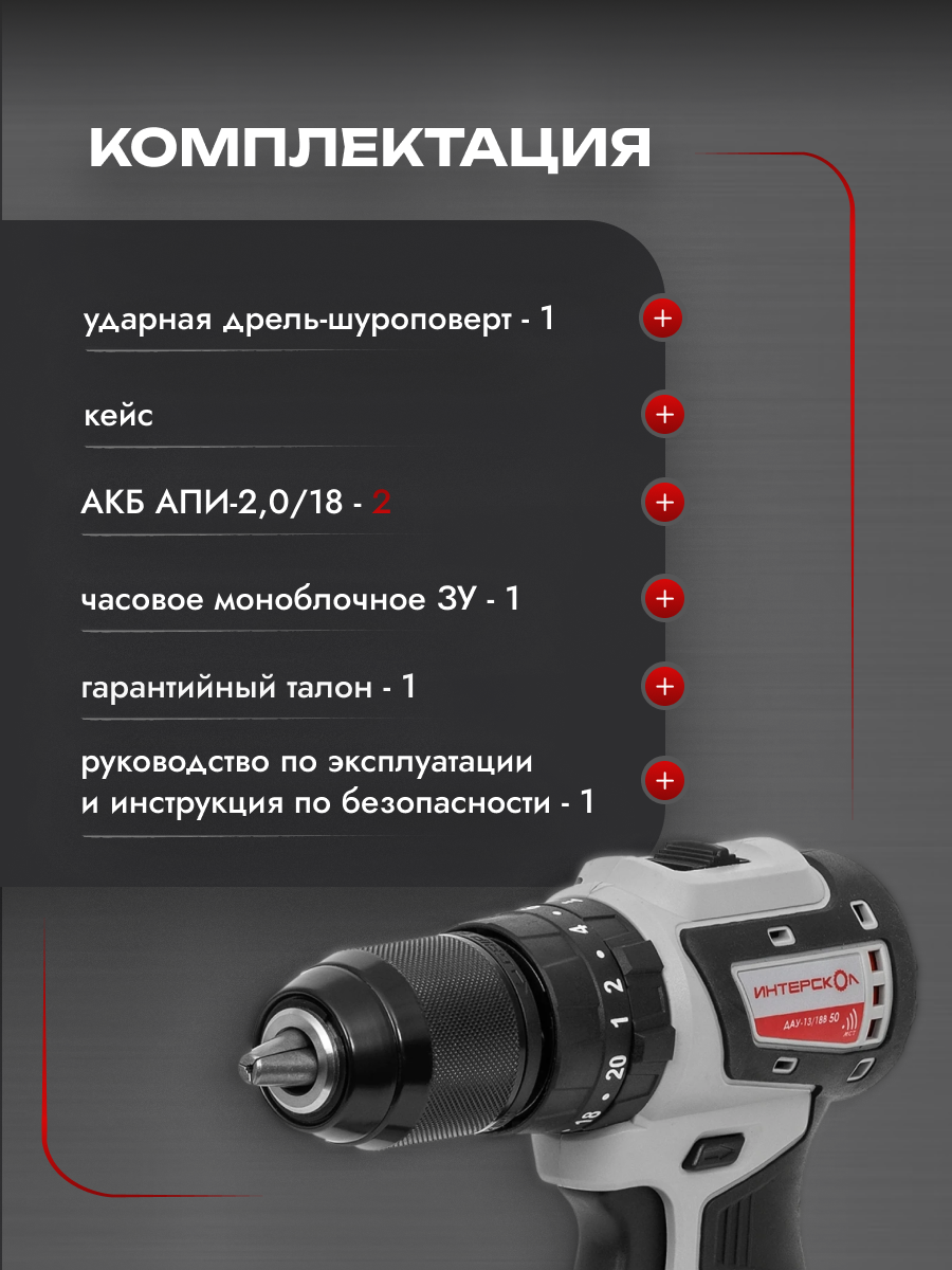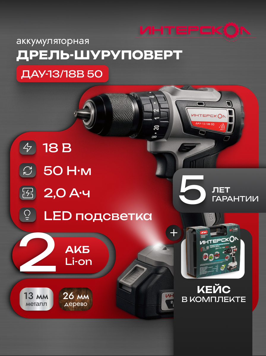 Аккумуляторная ударная дрель-шуруповерт ИНТЕРСКОЛ ДАУ-13/18В 50, 18В, 1600 об/мин, 27000 уд/мин, 2 АКБ и ЗУ (802.2.2.70): сравнение цен, характеристики, фото, актуальное наличие и цены.