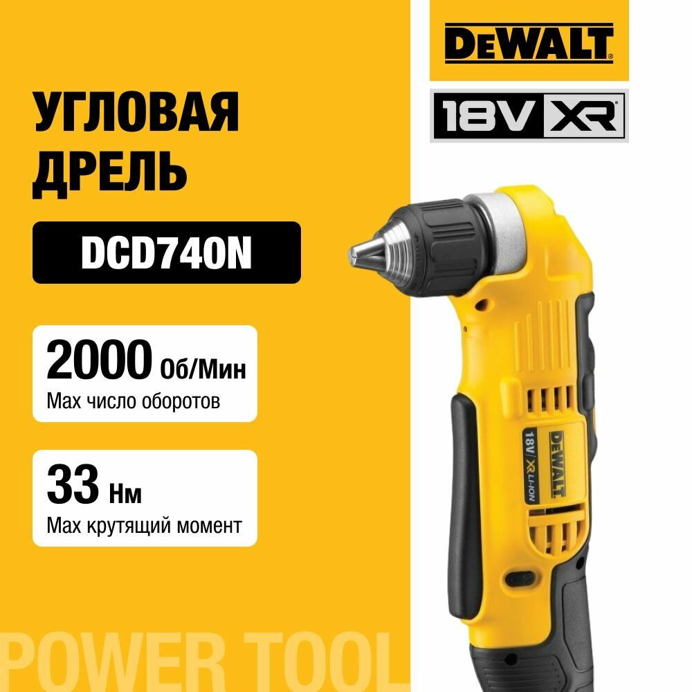 Аккумуляторная угловая дрель DEWALT DCD740N, 18 В, 2000 об/мин, без АКБ и ЗУ: сравнение цен, характеристики, фото, актуальное наличие и цены.