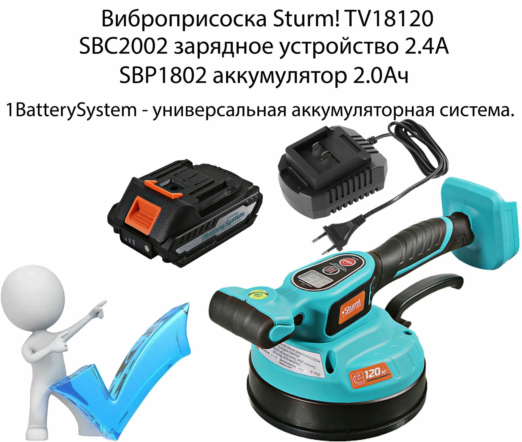 Аккумуляторная виброприсоска для укладки плитки Sturm! 1BatterySystem TV18120 1BatterySystem с АКБ и ЗУ в комплекте: сравнение цен, характеристики, фото, актуальное наличие и цены.