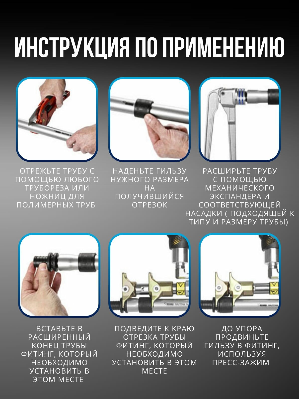 Сантехнические зажимные инструменты для систем из металлопластика, нержавейки. Гидроинструмент подходит для труб из сшитого полиэтилена. Обжимные клещи просты в использовании, Вам достаточно отрезать трубу необходимого размера, надеть надвижную гильзу, увеличить трубу с помощью экспандера, вставить фитинг и сделать аксиальную запрессовку, прессование. Стабильное и мощное обжатие.