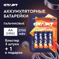 Универсальный и надежный источник питания для различных электронных устройств – это аккумуляторные пальчиковые батарейки AA (HR6) Ni-Mh с энергоемкостью 2700 мАч бренда старт. Они работают безупречно в самых разных ситуациях, делая вашу технику по-настоящему эффективной. Современные гаджеты стали неотъемлемой частью нашей жизни: компьютерные мышки, клавиатуры, фонари, микрофоны; диктофоны, MP3-плееры, часы, цифровые камеры; энергоемкие электро аппараты, фотоаппараты, фотовспышки, микрофоны; игровые консоли, телевизоры ( тв ), часы; весы, радиоуправляемые модели разных типов - все они нуждаются в энергии. Комплект четырех мощных батарей отличного качества обеспечивает высокую производительность и эффективное использование вашего гаджета дома, позволяя наслаждаться развлечениями, играми и аудио. Такая новинка также идеальна для детских игрушек: автомобилей на радиоуправлении, игрушечных роботов и других. Перезаряжаемая мини батарейка - это не только надежный элемент питания для приборов, но и супер выбор для качественной работы электроники. Премиум (premium) многоразовые батареи справятся с любыми задачами. Такая новиночка – это хороший подарок (подарочный набор) на праздники, который оценят мужчины и женщины, парни и девушки всех возрастов. Официальная продукция оригинал отличается экономичностью и долговечностью. В отличие от обычных батареек аккумуляторы держат напряжение 1,2 вольта в течение всего времени работы, а не снижают его. NiMH-аккумуляторы не имеют “эффекта памяти”, вам не нужно полностью разряжать их перед зарядкой. Рассчитаны на 500 циклов заряд / разряд. Батарейки работают при низких и высоких температурах. Не рекомендуется одновременно заряжать в одном адаптере аккумуляторы разных химических систем, производителей и типоразмеров. Запрещается нагревать аккумуляторы, разбирать, паять, бросать в огонь; глотать и давать маленьким детям.