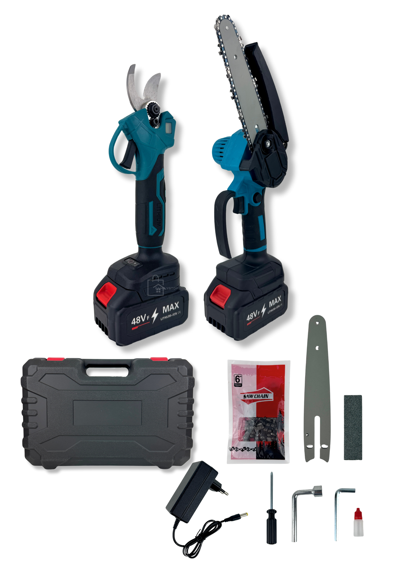 Купить Аккумуляторный бесщеточный электроинструмент 2в1 — секатор и цепная пила с двумя аккумуляторами в комплекте с доставкой по всей России.