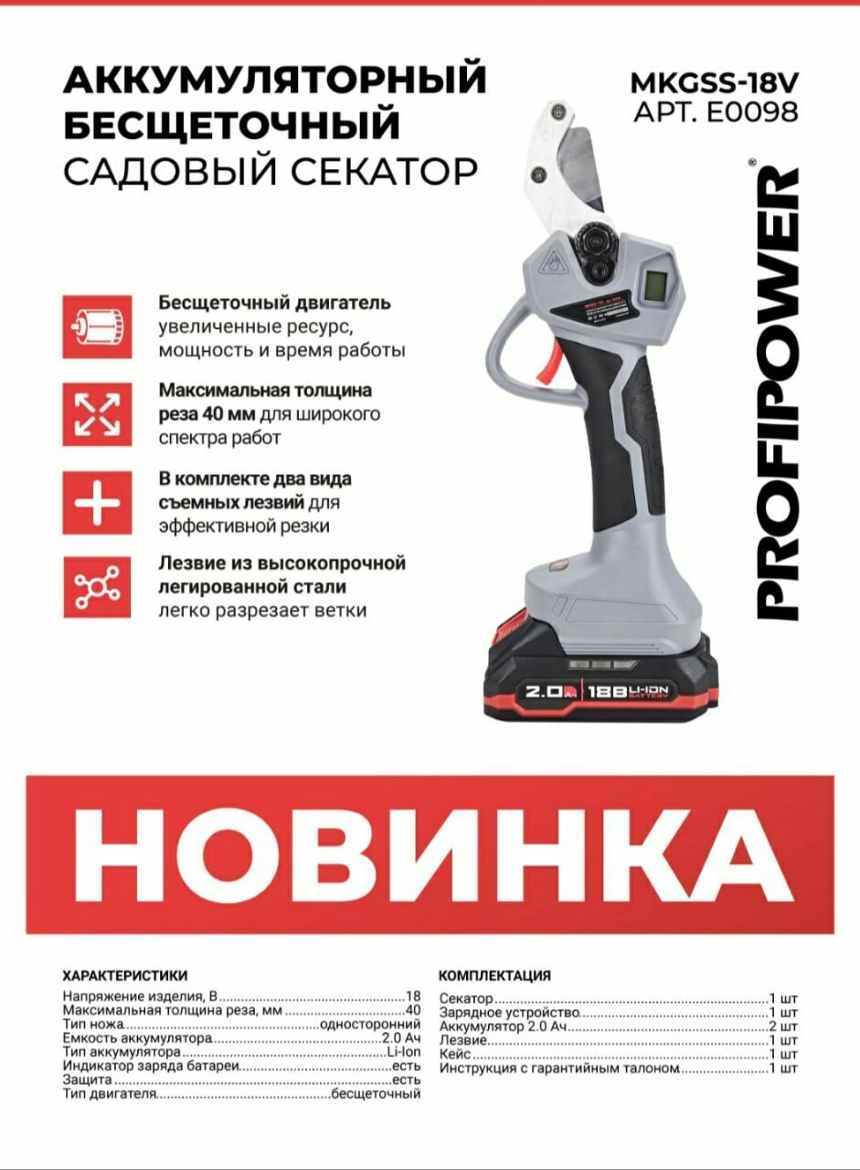 Купить Аккумуляторный бесщеточный садовый секатор MKGSS-18V ProfiPower с доставкой по всей России. Аккумуляторный бесщеточный садовый секатор MKGSS-18V ProfiPower: сравнение цен, характеристики, фото, актуальное наличие и цены.