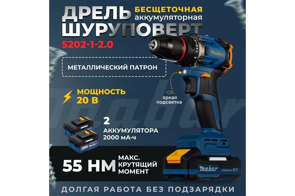 Аккумуляторный бесщеточный шуруповерт, 20 В, 55 Нм, 2 АКБ Mabar 5502-1-2.0: сравнение цен, характеристики, фото, актуальное наличие и цены.