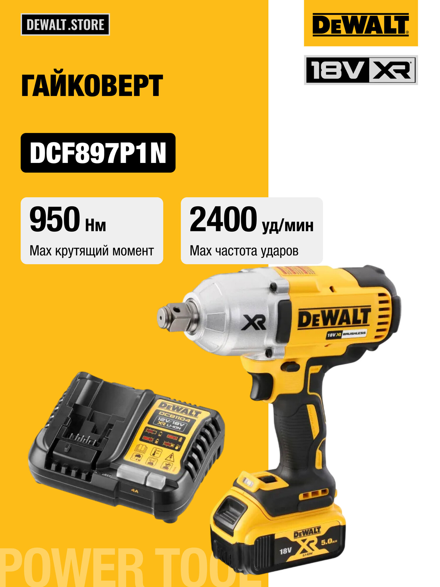 Аккумуляторный гайковерт DEWALT DCF897P1, 18 В, 950 Нм, 2400 уд/мин, с АКБ 5 Ач и ЗУ: сравнение цен, характеристики, фото, актуальное наличие и цены.